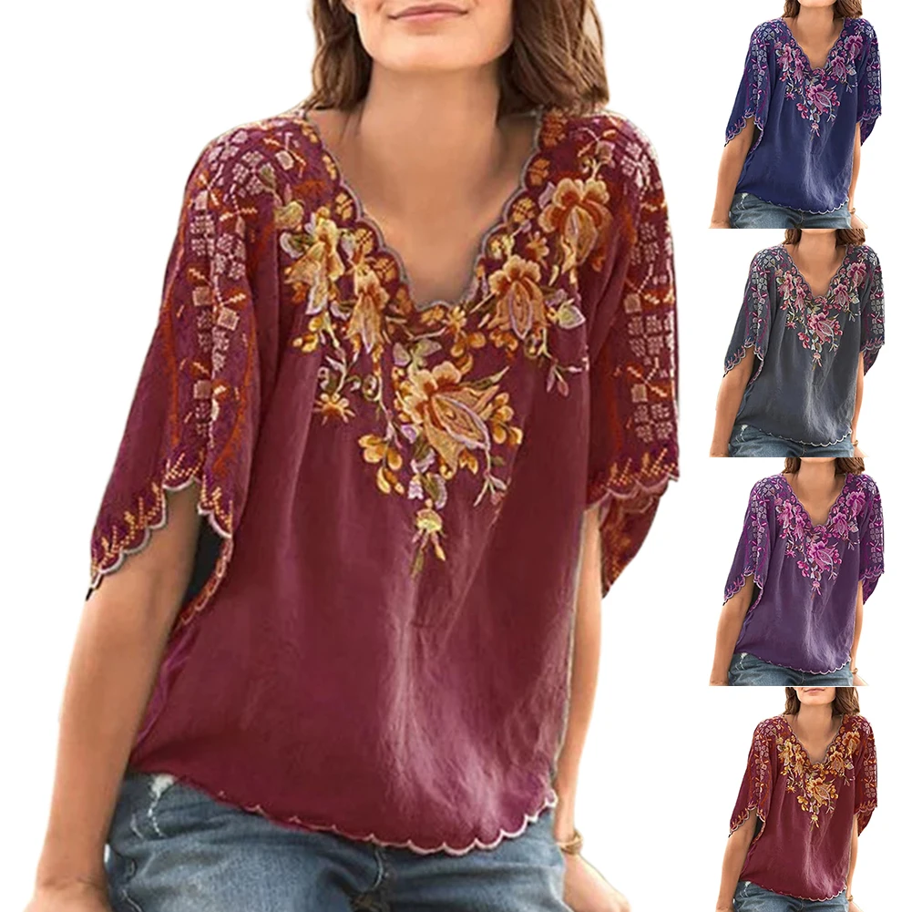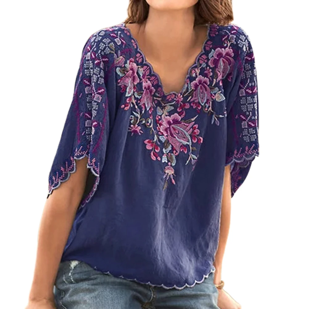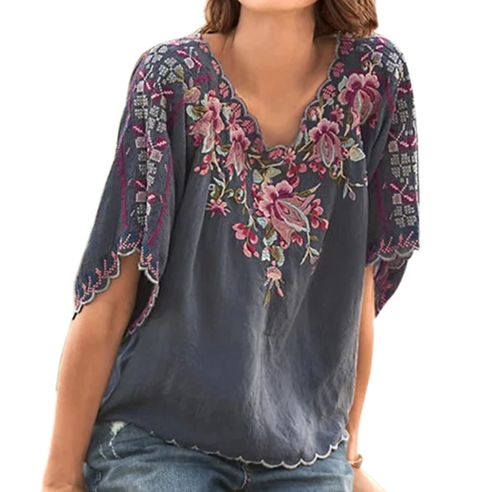 Женская футболка размера плюс с v-образным вырезом и коротким рукавом с цветочной вышивкой