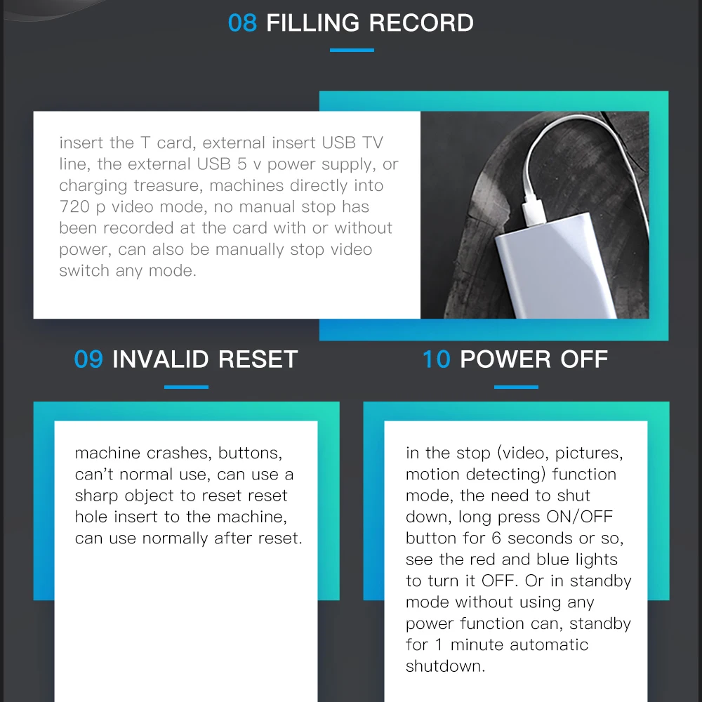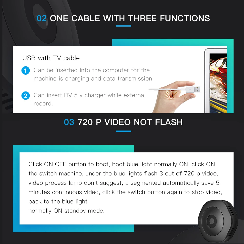 1. Небольшая Камера может выпустить тепло при использовании. Это нормальное явление. Пожалуйста, поторопитесь. Мини-камера безопасности предназначена для защиты важных семей и собственности. 2. Из-за длительного времени транспортировки, батарея крошечной камеры находится в низкой мощности, радует зарядку за 1 - 2 часа до использования. 3. Мини-камера поддерживает micro SD карту класса 10 4-32 ГБ, если нет записей, пожалуйста, проверьте размер sd-карты или отформатируйте sd-карту на FAT32.