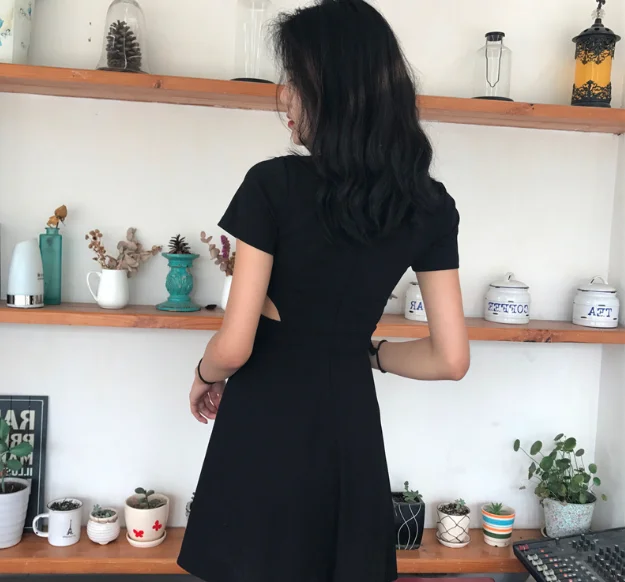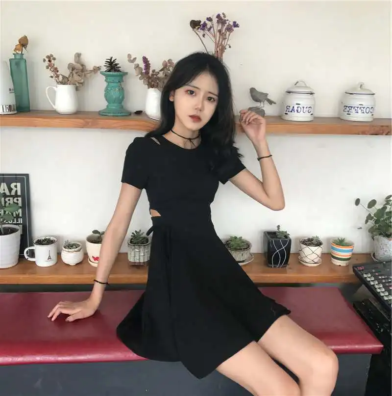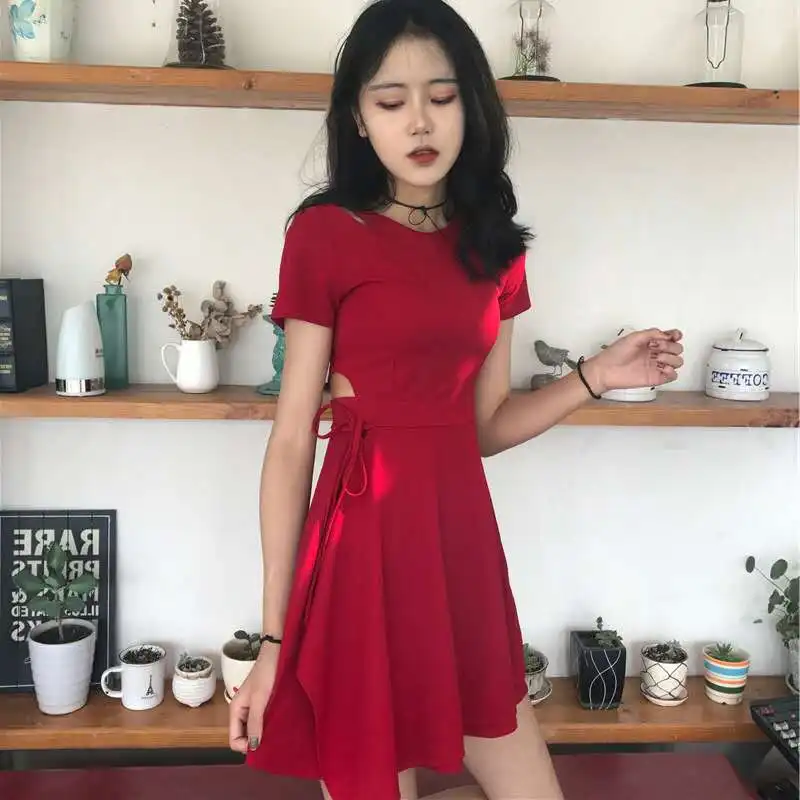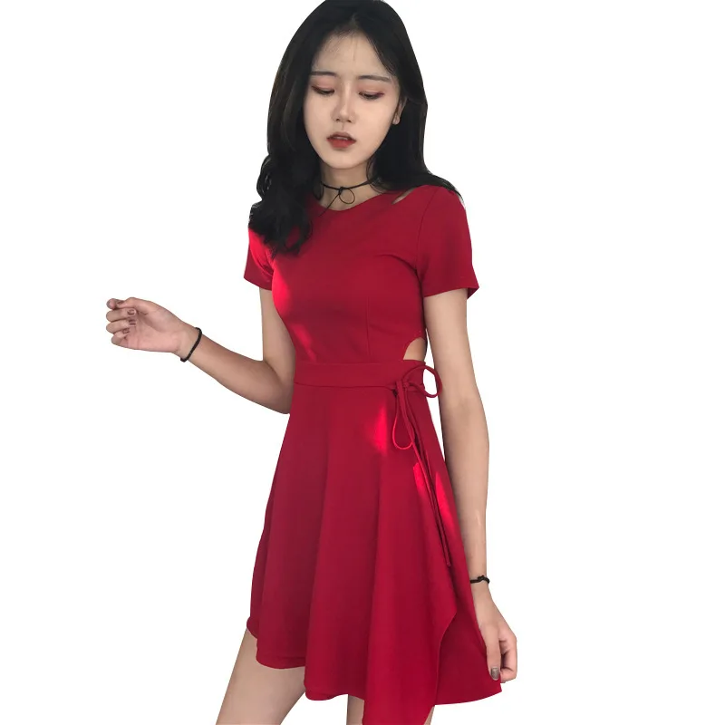 Summer women's clothes round neck short sleeves solid color cutout slim-fit ruffled skirt woman dress