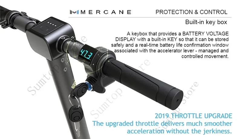 1. Функция активации ключа Функция активации нового ключа может предотвратить Запуск скутера другим. 2. Дисплей напряжения Новый дисплей напряжения может четко видеть оставшуюся мощность. 3. Обновленная общая рамка Общая рама усовершенствована более однородным и твердым.