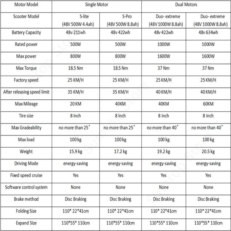 Модель скутера: S-lite , S-pro , Duo-extreme , Duo-ultimate Модель двигателя: одномоторный, двухмоторный Мощность двигателя: 500 Вт бесщеточный двигатель Метод торможения: дисковое торможение Напряжение: 48 в Размер шин: 8 дюймов Цвет: черный Максимальная нагрузка: 100 кг Время зарядки: около 6-8 ч Размер расширения: 110*55*110 см Размер складывания: 110*22*41 см Вес: 15,9 кг, 17,2 кг, 19,2 кг, 20,5 кг Материал: алюминиевый сплав + непневматическая шина