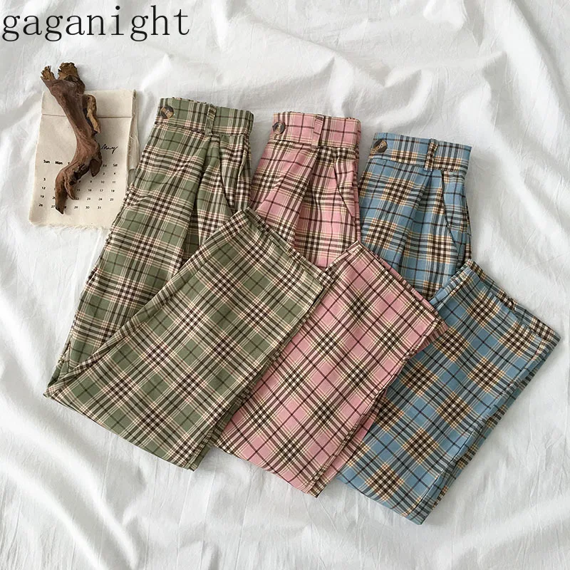 Женские клетчатые прямые брюки Gaganight, повседневные свободные брюки в Корейском стиле с высокой талией, винтажные брюки на весну и лето