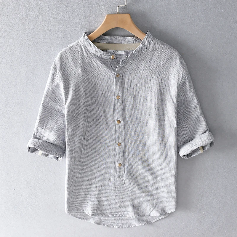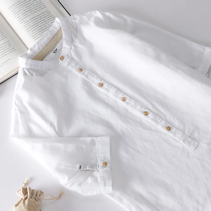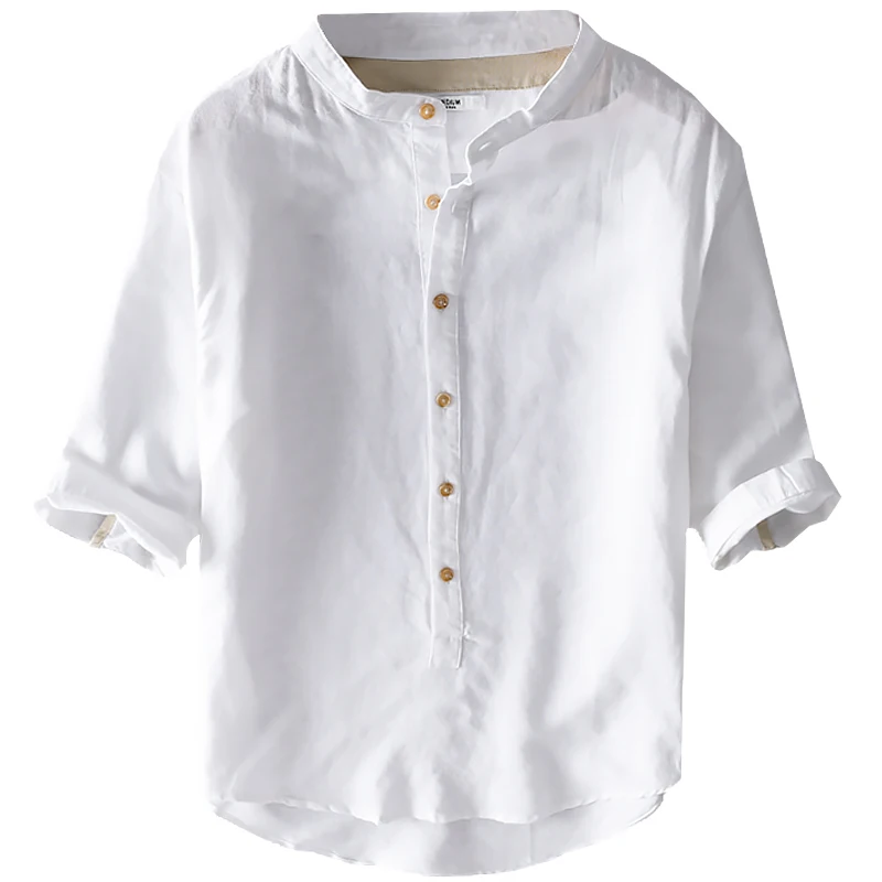 Новинка лета 2020, белая рубашка с воротником-стойкой, мужские брендовые льняные и хлопковые рубашки для мужчин, мужская рубашка с рукавом три четверти, camisa