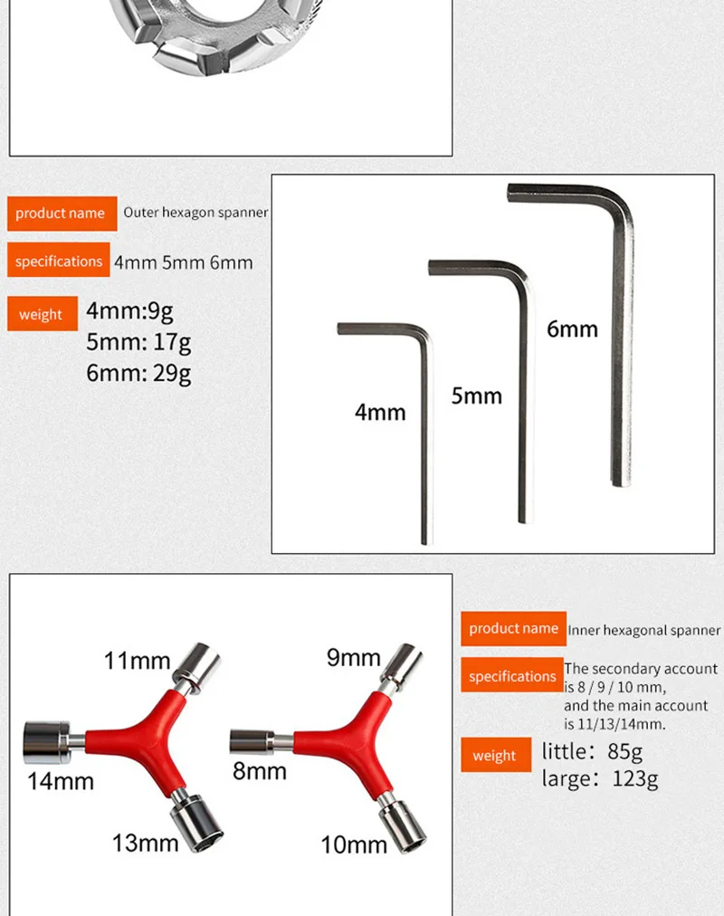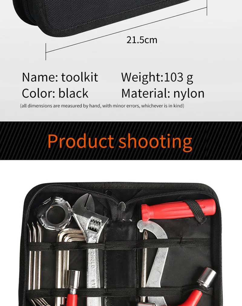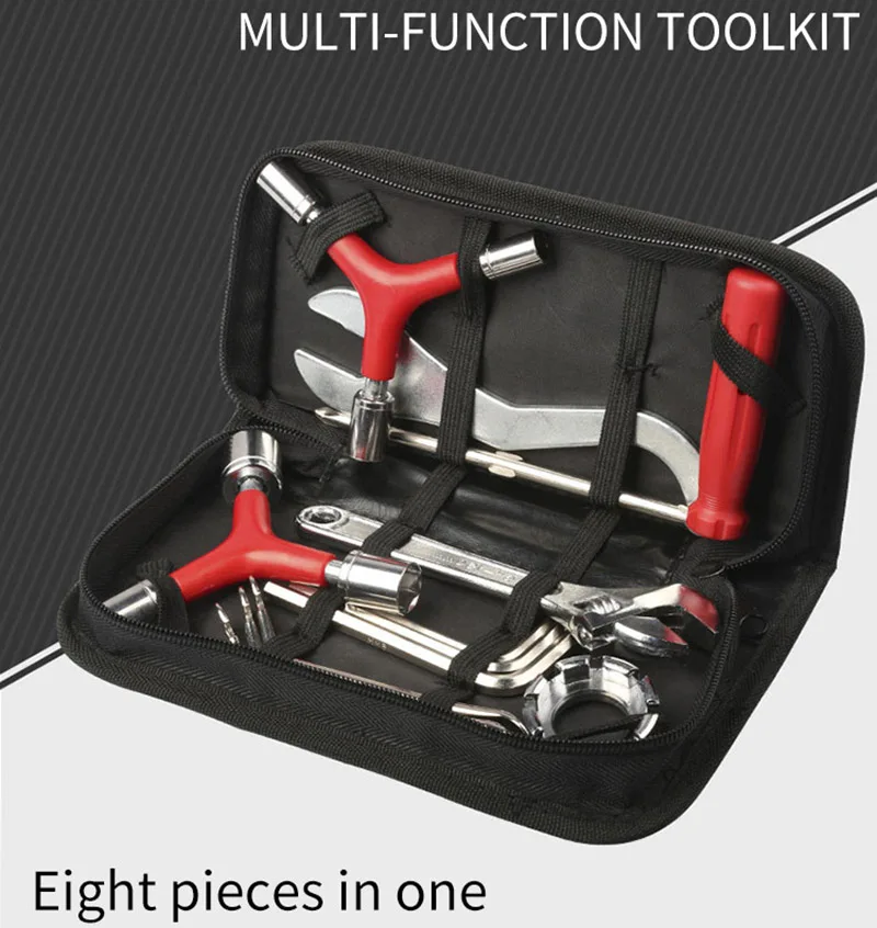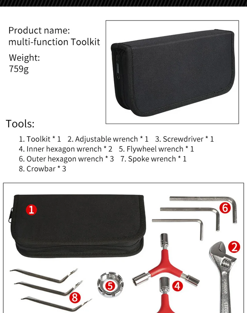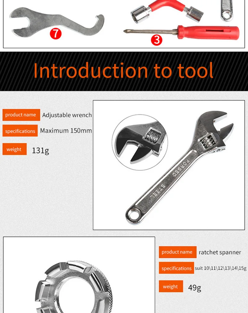 Название: многофункциональный набор инструментов Вес: 750 г Упаковочный лист: 1 * набор инструментов 1 * регулируемый ключ, дюймовый стандарт 1 * отвертка 2 * шестигранный ключ, дюймовый стандарт 1 * гаечный ключ 3 * наружный шестигранный ключ 1 * маховик ключ, дюймовый стандарт 3 * Шина рычаг