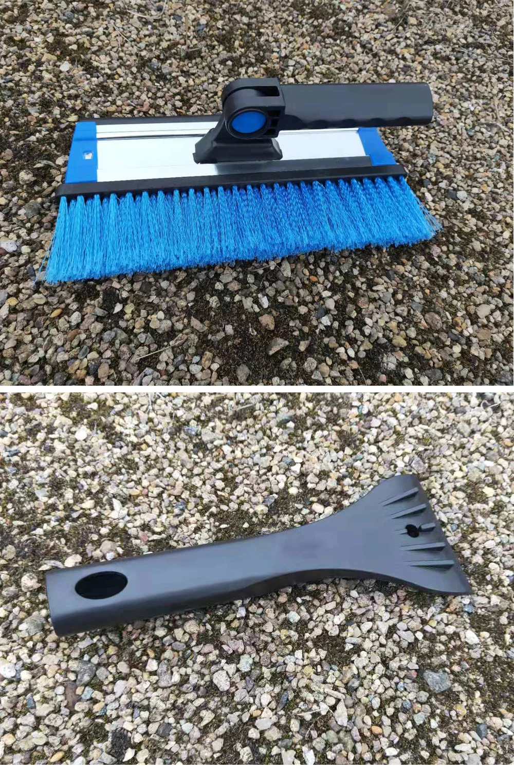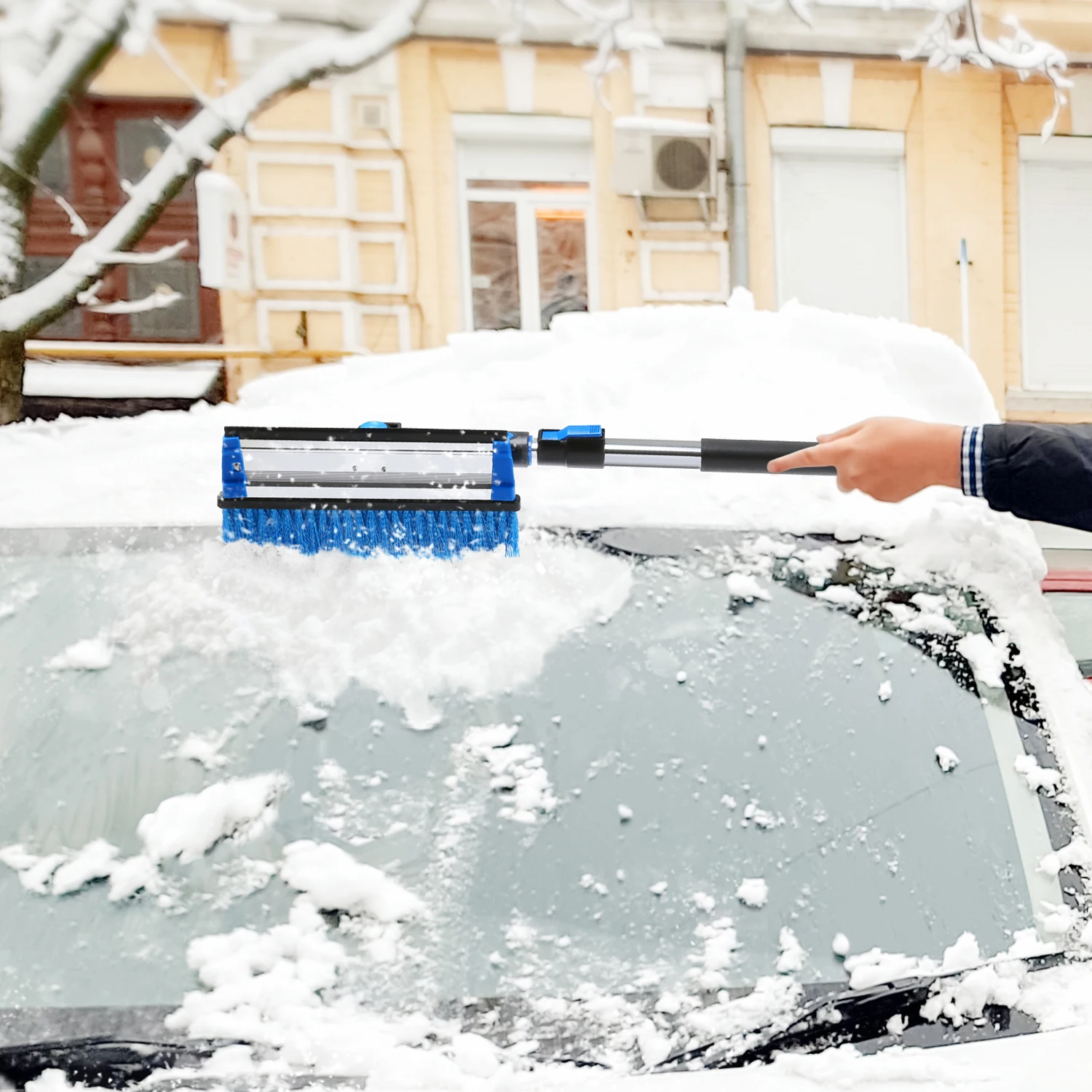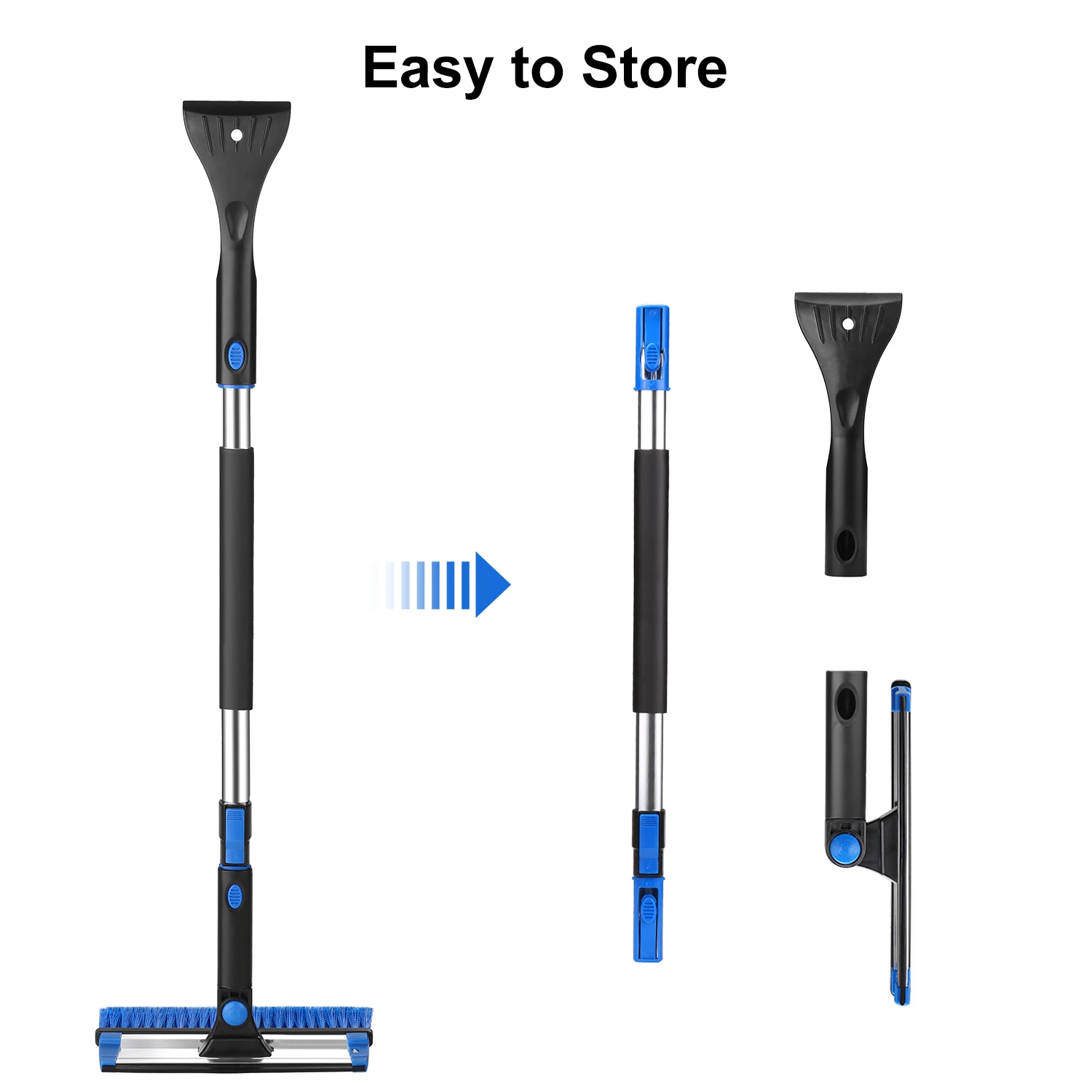 HEIGHT ADJUSTABLE: the brush is collapsible to be adjusted into 36, 43 or 50 inches; ideal for any car size and the whole car body HEAD ROTATABLE: allows you to set the brush at an optimum angle to remove the snow or ice from your car windshield, top, and hood DOUBLE SCOOP: the bristle brush is wide and skillful to clean the car body; a rubber scoop down the other end is to remove the ice gently from the window ERGONOMIC GRIP: equipped with a foam handle grip, as it means you can enjoy a warm and lightful experience when shoveling SPACE SAVING: with the 3-piece collapsible shaft, the shovel is easy to disassemble for storage; the brush is able to be used individually