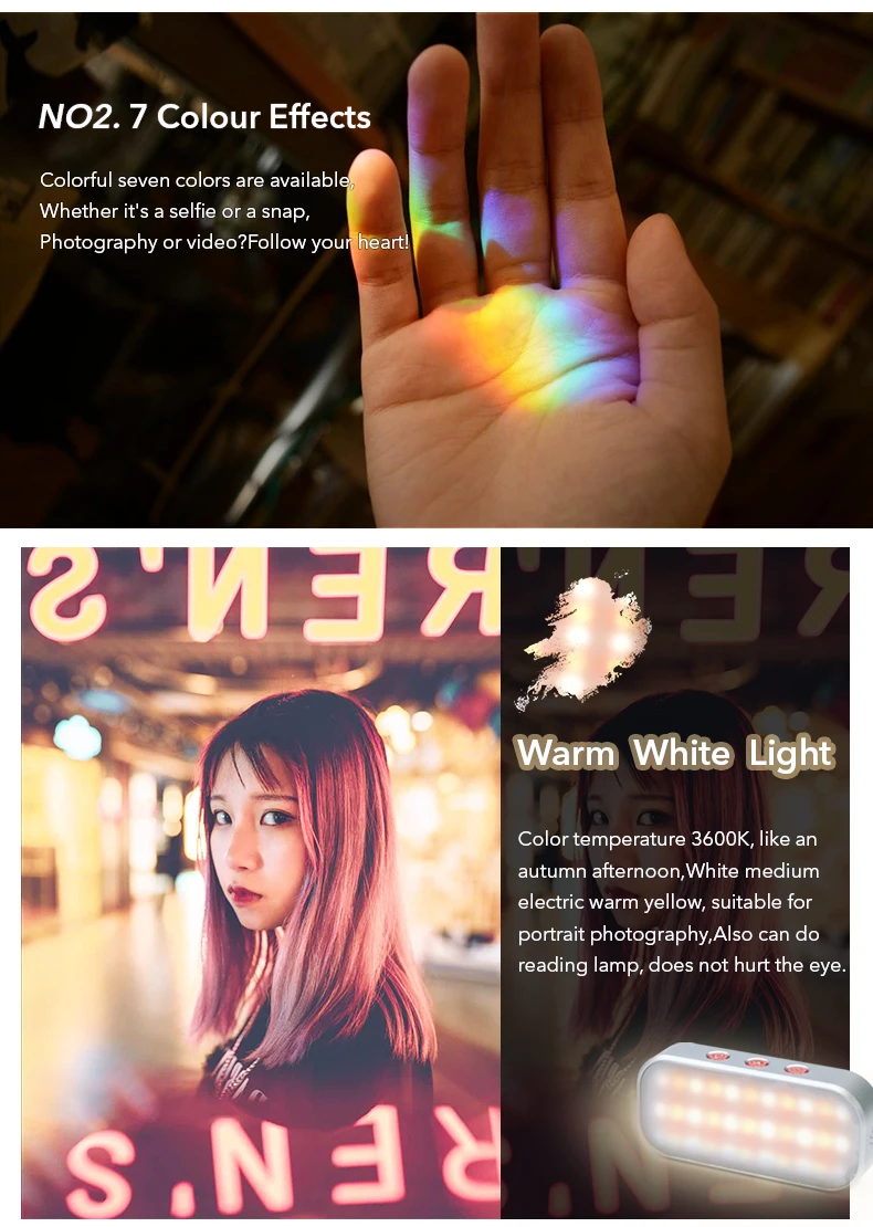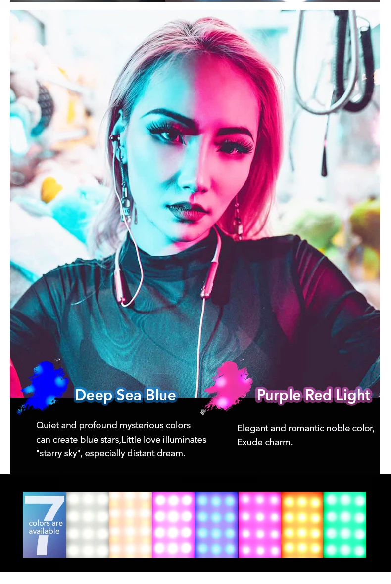 Model: APL-FL02 Performance: Multifunctional 7-color fill light Material: aluminum alloy + PVC Lamp beads composition: 18 white light / 15 RGB, color temperature 3200-5200k Battery capacity: 3.7V, 360mAh, charging for about 45 minutes Luminous duration: about 60 minutes for white light and 180 minutes for colored light Size: 115 * 85 * 25mm