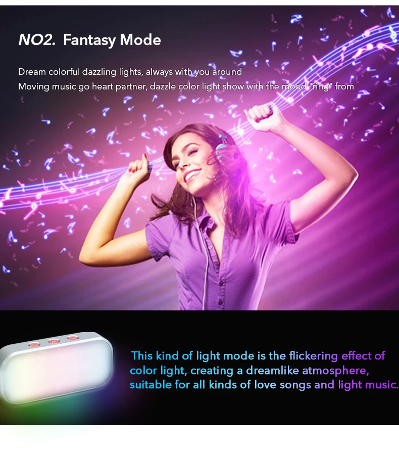 power button: Function 1-Press and hold for three seconds to turn on / off. Function 2-Brightness adjustment function: The brightness of the lights in various modes can be adjusted when the machine is turned on. There are three levels of brightness adjustment, which can be switched cyclically. Ai Mode: Press the button once in the power-on state to enter the music smart light mode. In this mode, the smart light can identify the rhythm of the music and change the flashing frequency and light color according to the music or sound rhythm. Press once to enter DJ mode and press again to enter mode. Steady key: Press this key once in the power-on state to enter the constant light mode. There are 7 light colors in this mode. Click to switch to another one to cycle through different colors. Positive white light-warm white light-purple red light-orange light-deep sea blue light-purple light-lime light
