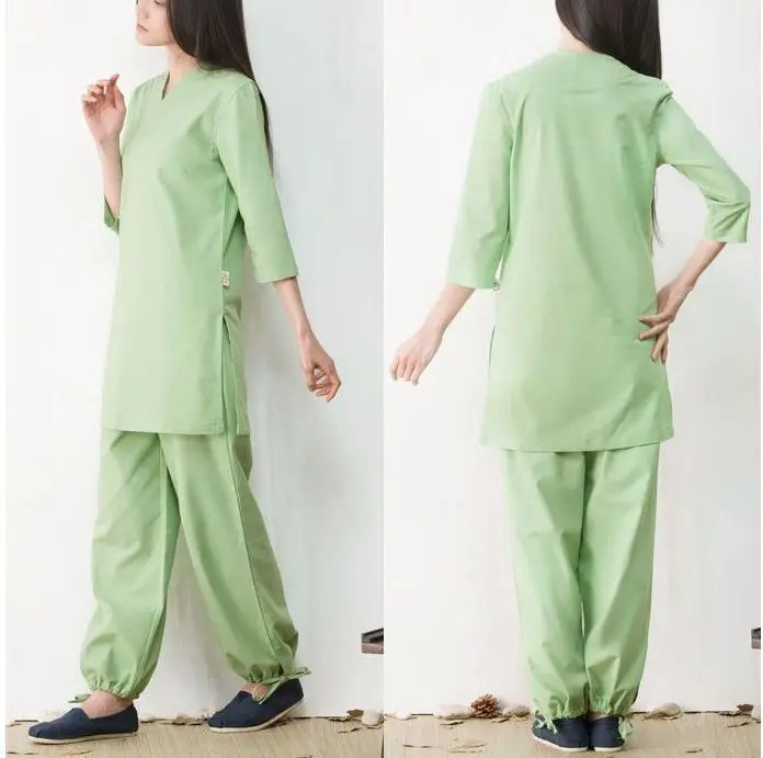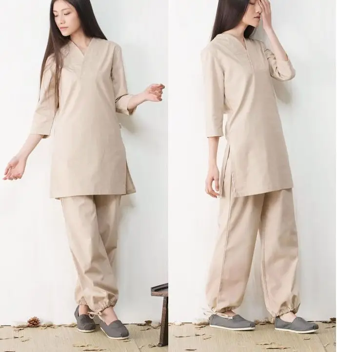 Material:High quality cotton and linen Packge including: Tops+pants Permeability is good,Moisture absorption,breathable, Bacteriostatic environmental, comfortable Suitable for Summer and Spring and Autumn wear.