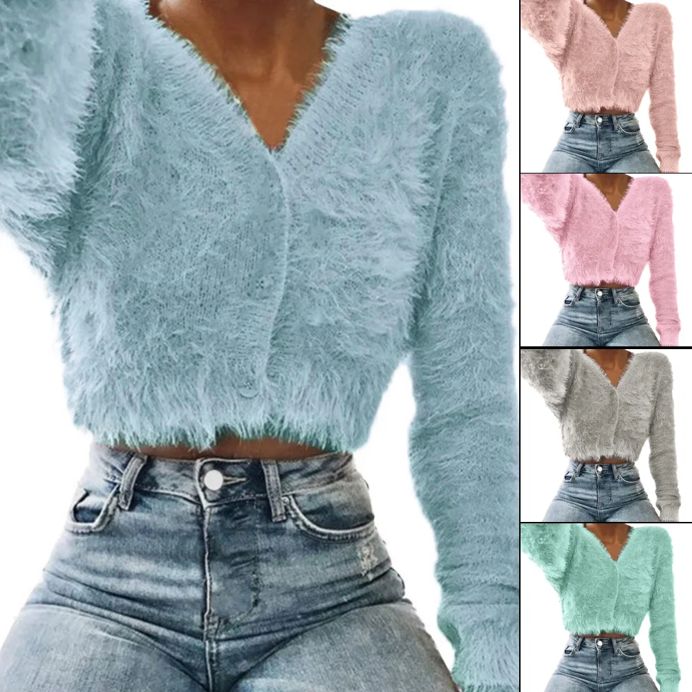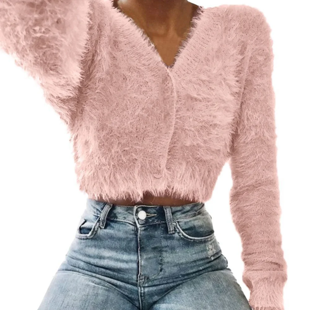 Женский осенне-зимний однотонный плюшевый свитер с v-образным вырезом и длинными рукавами на пуговицах, пальто