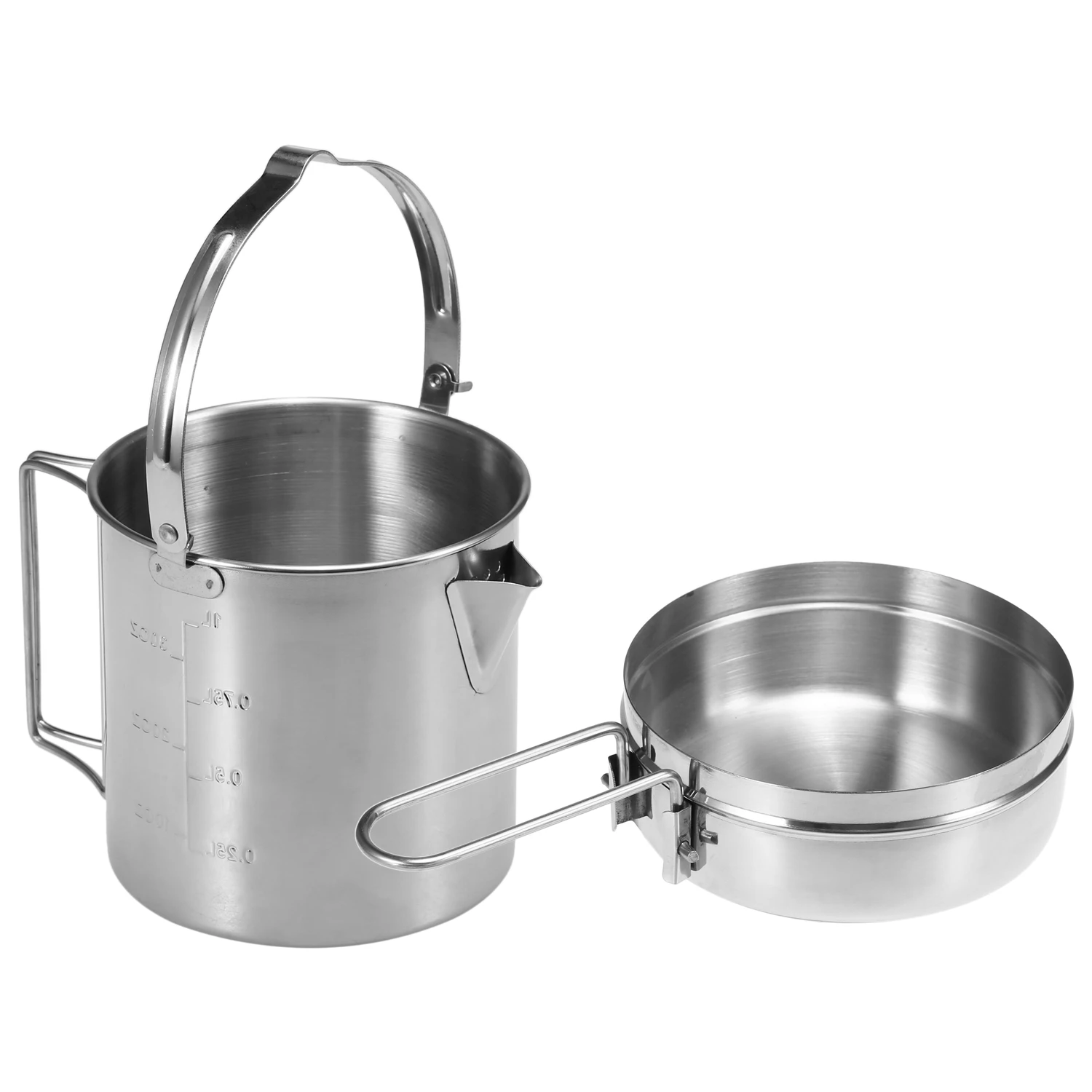 This camping kettle is made with stainless steel, corrosion-resistant and durable. It features a pouring spout, lid, and foldable handle for convenient use. It is perfect for outdoor camping, hiking, backpacking, etc.