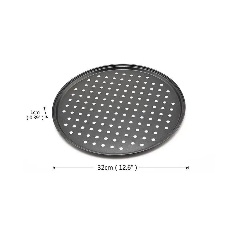 Покрытие на этой сковороде для пиццы предназначено для длительной работы. 32 см сковорода для пиццы с перфорированной поверхностью тяжелого калибра (1,0 мм) стальная конструкция антипригарная внешняя и внутренняя толстые перемещенные края посудомоечная машина безопасна.