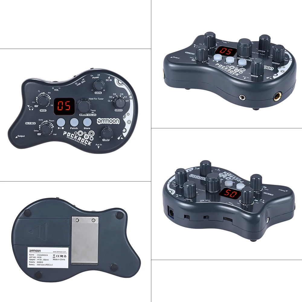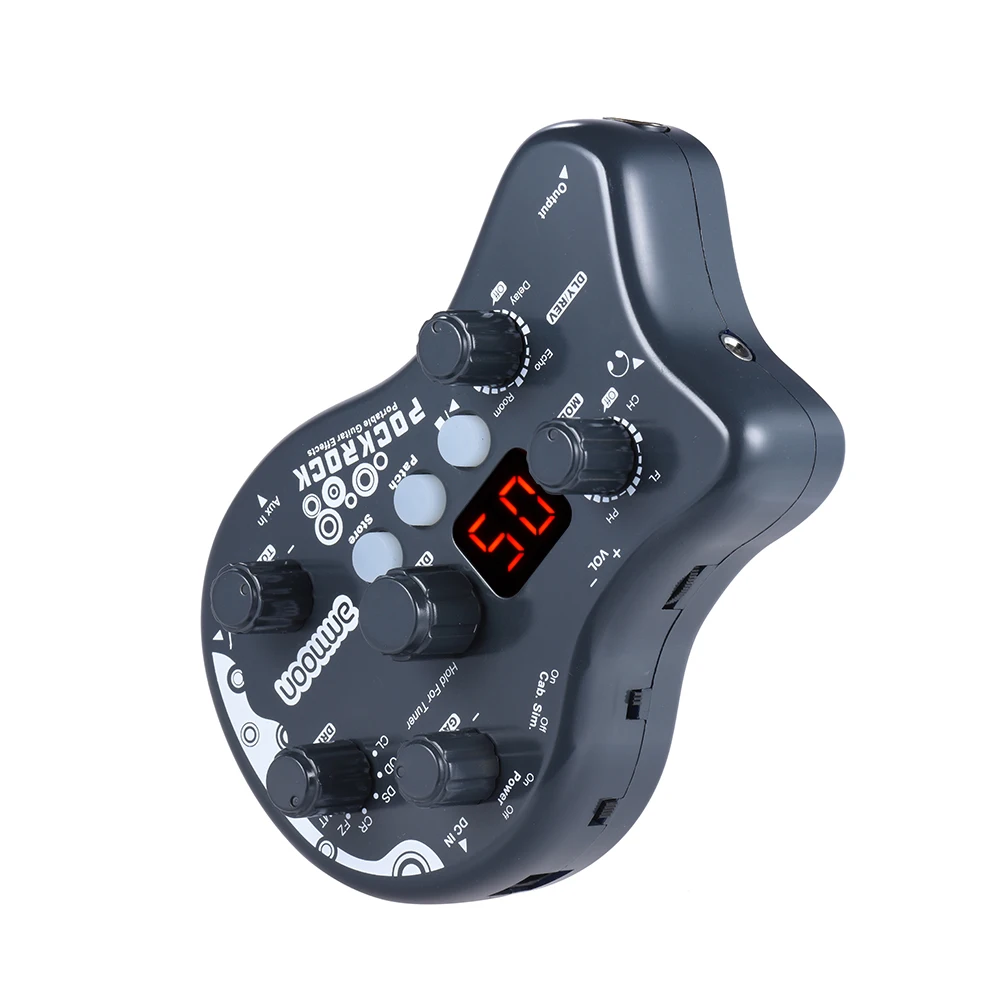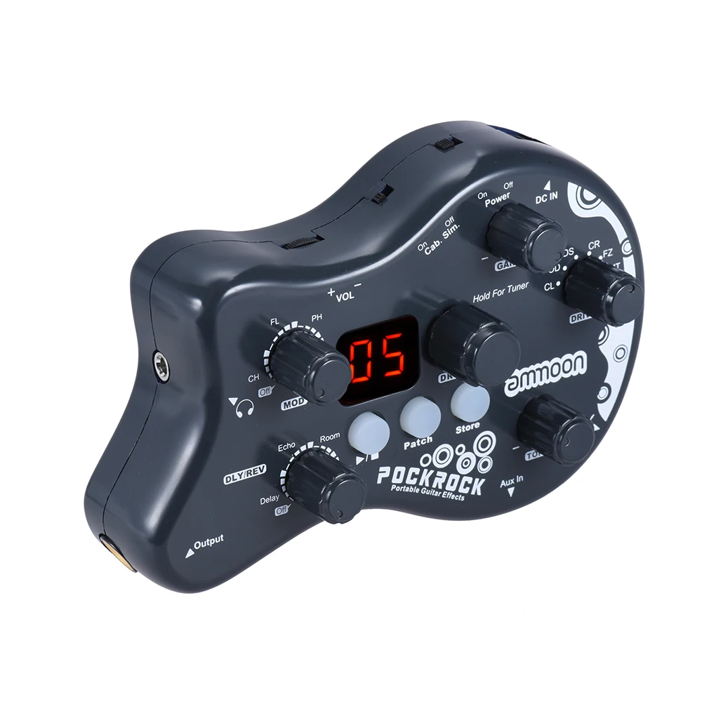 AmmoonPockRock-это портативная гитарная педаль с несколькими эффектами. 5 модулей эффектов с 15 типами эффектов, 40 барабанных ритмов, 16 заданных патчей и 16 пользовательских патчей. Это не только звуковая библиотека, но и позволяет создавать собственную звуковую библиотека. С наушниками и AUX in вы можете наслаждаться игрой ночью и не беспокоиться о беспокойстве других. Режим работы от аккумулятора позволяет брать его везде. Все, что вам нужно, находится в PockRock!