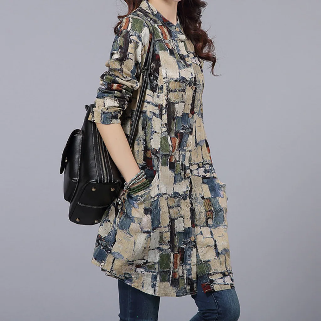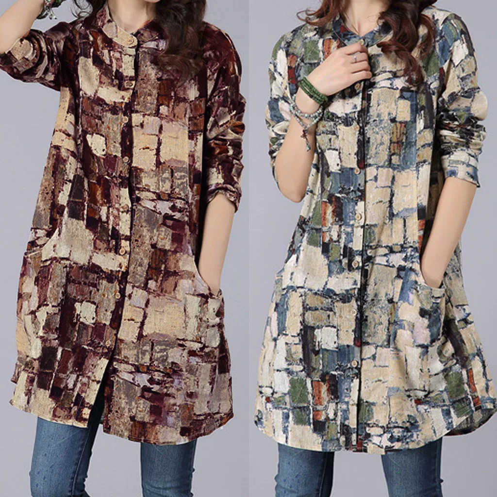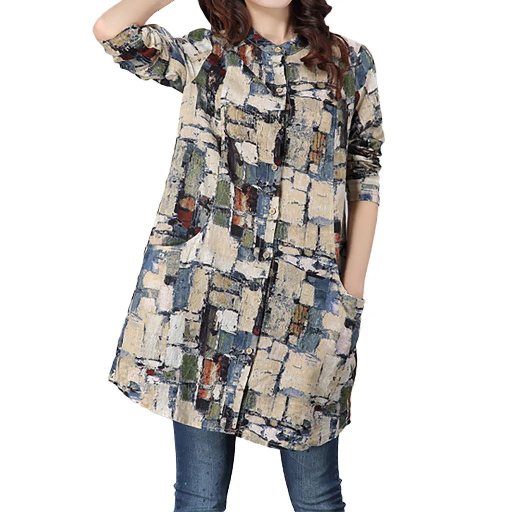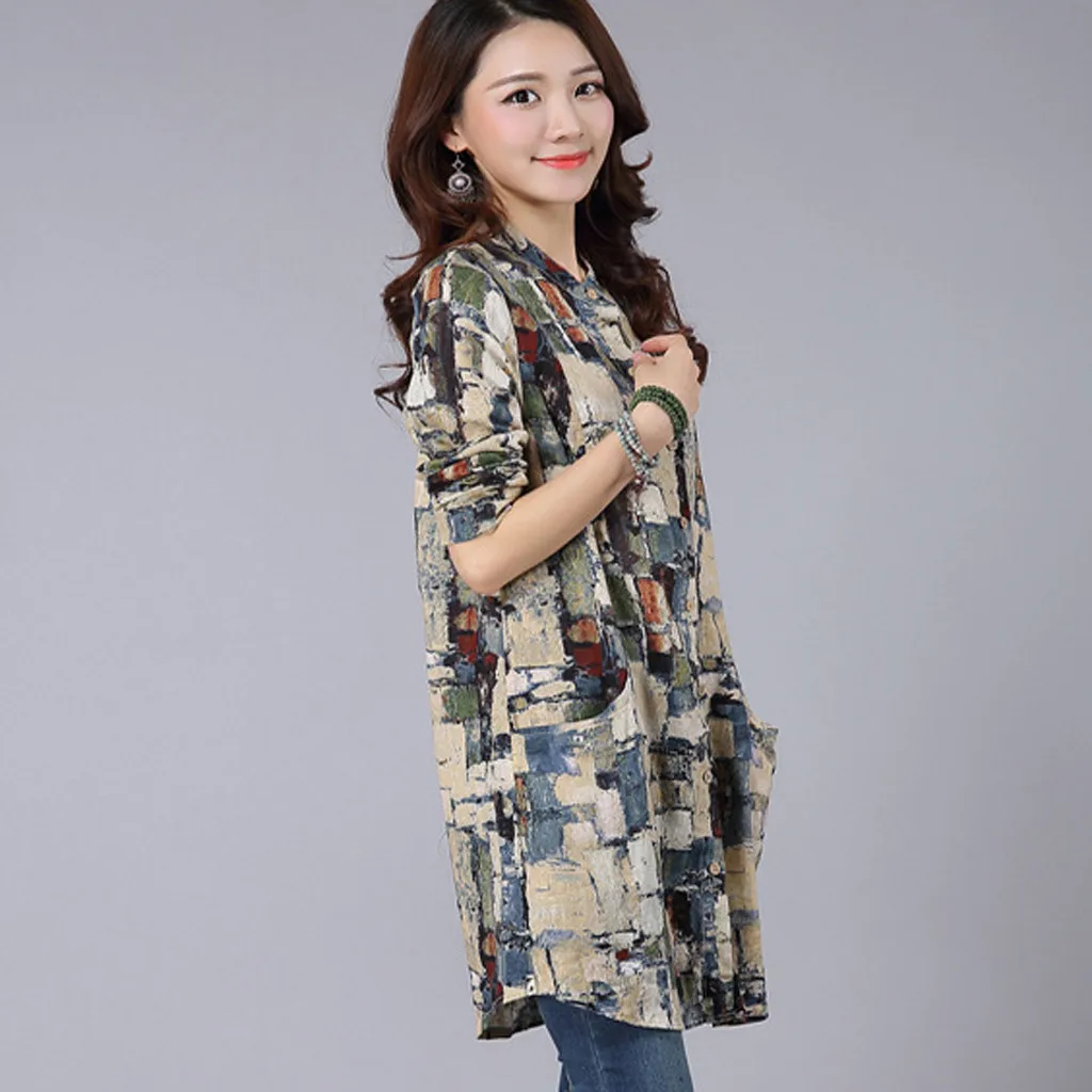 Хлопковая льняная рубашка средней длины с длинными рукавами футболка с воротником и принтом