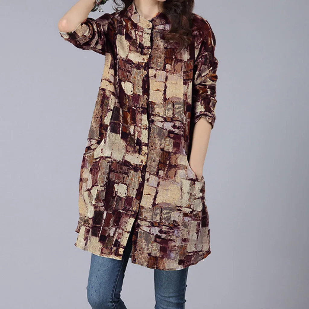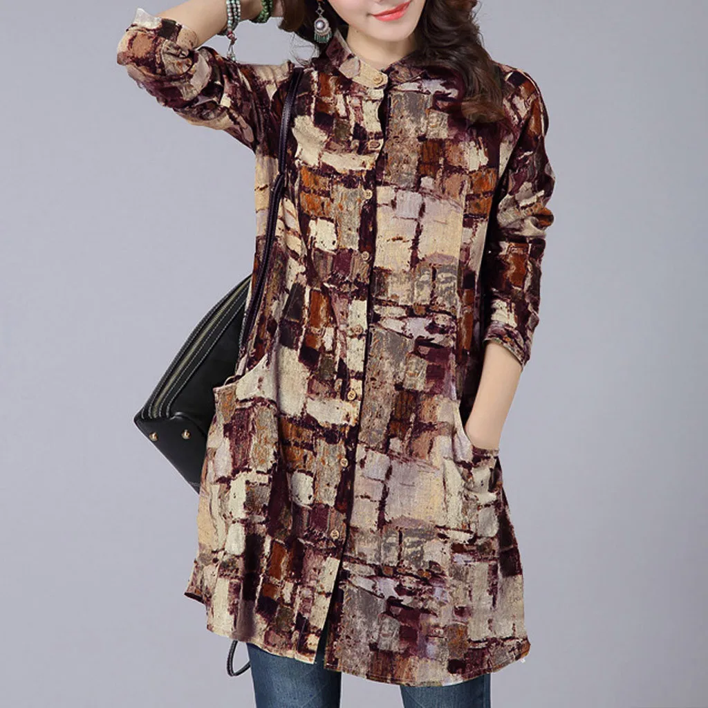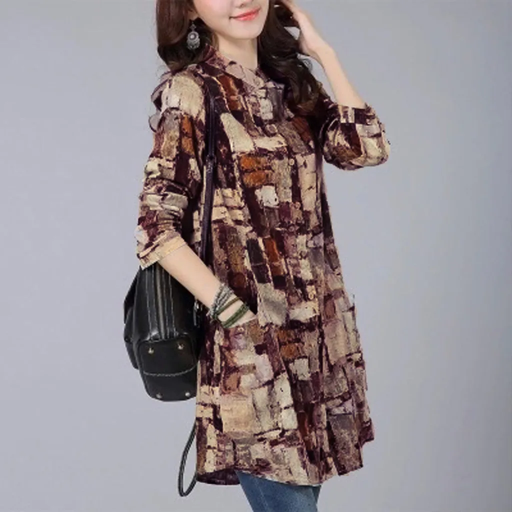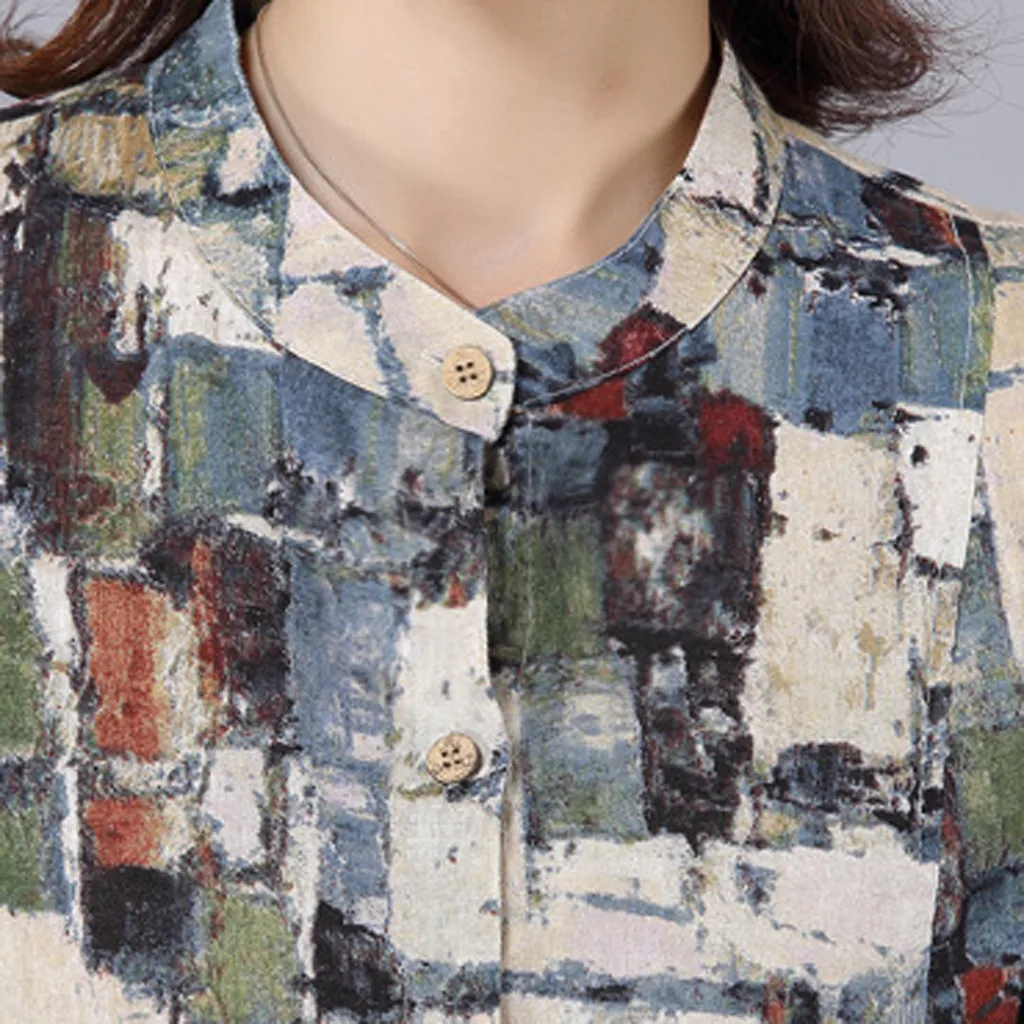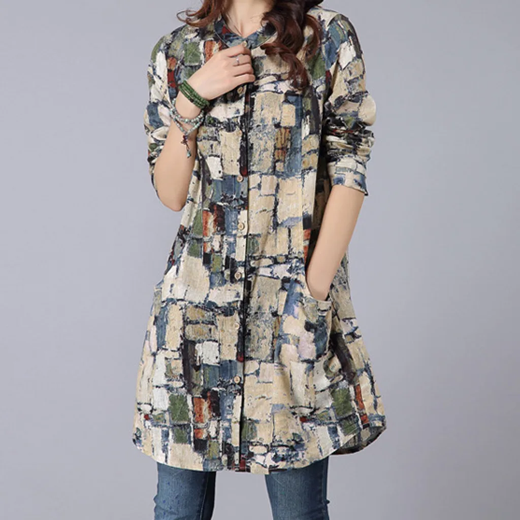 Хлопковая льняная рубашка средней длины с длинными рукавами футболка с воротником и принтом