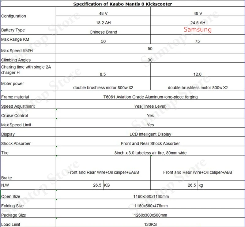 Модель: Kaabo Mantis 8 Конфигурация: 48В 24,5 Ач/48В 18,2 Ач Марка аккумулятора: литиевая батарея Samsung/Китайская литиевая батарея Макс. Диапазон: 75 км/50 км Макс. Скорость: 50 км/ч Макс. Восхождение: 30 ° Время зарядки с помощью одного зарядного устройства: 12 ч/8,5 ч Мощность двигателя: двойной бесщеточный двигатель 800 Вт X 2 Материал оправы: авиационный алюминий T6061 + цельная ковка Тормоз: передний и задний провод + Масляный суппорт + EABS Амортизатор: передний и задний амортизатор Шина: бескамерная воздушная шина 8 дюймов x 3,0, ширина 80 мм Вес нетто: 26,5 кг Размер посылка: x мм