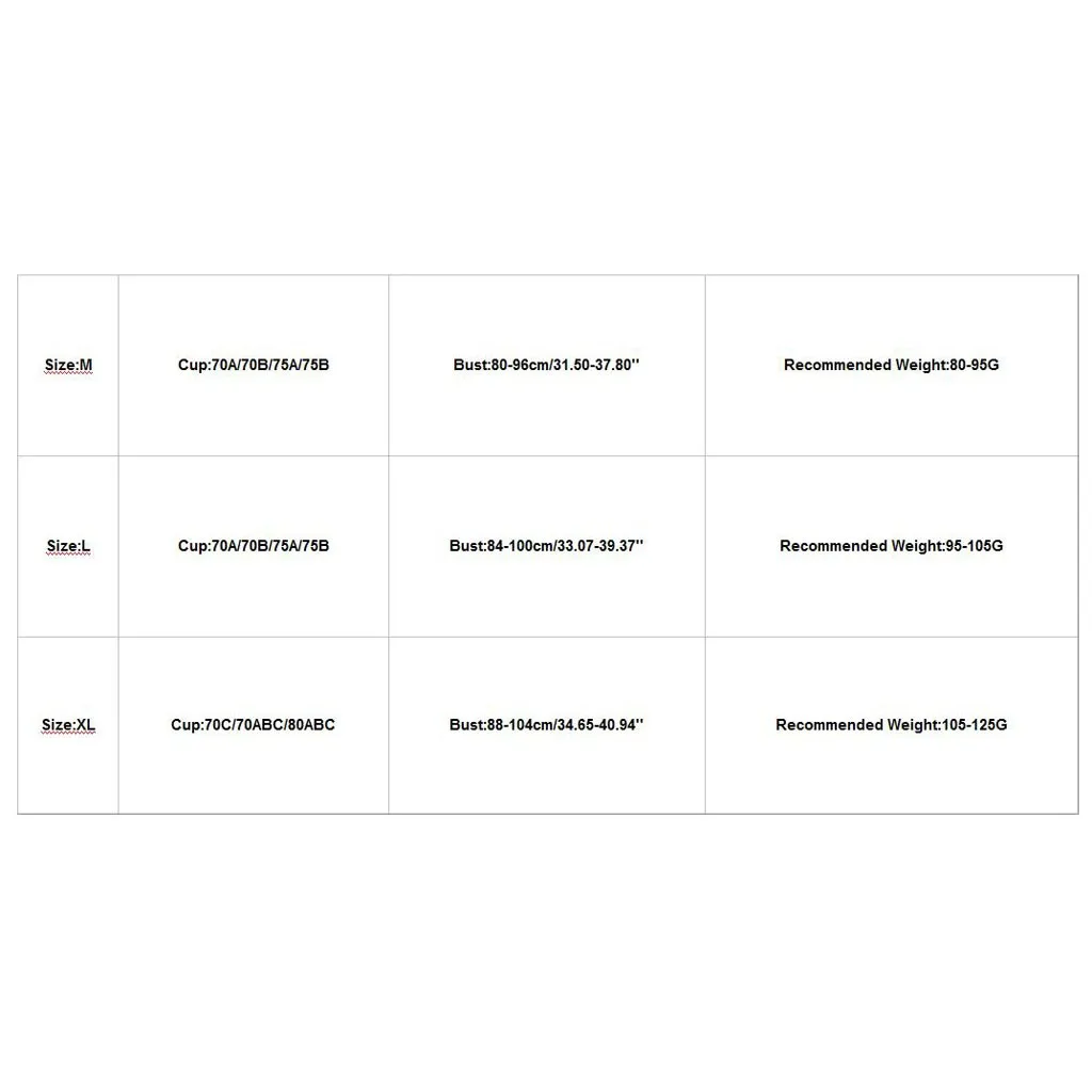 Size Cup Bust Recommended Weight M 70A/70B/75A/75B 80-96cm/31.50-37.80'' 80-95G L 70A/70B/75A/75B 84-100cm/33.07-39.37'' 95-105G XL 70C/75ABC/80ABC 88-104cm/34.65-40.94'' 105-125G