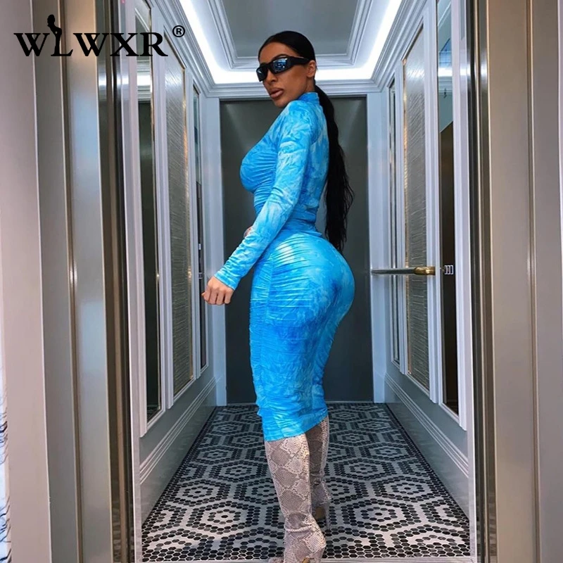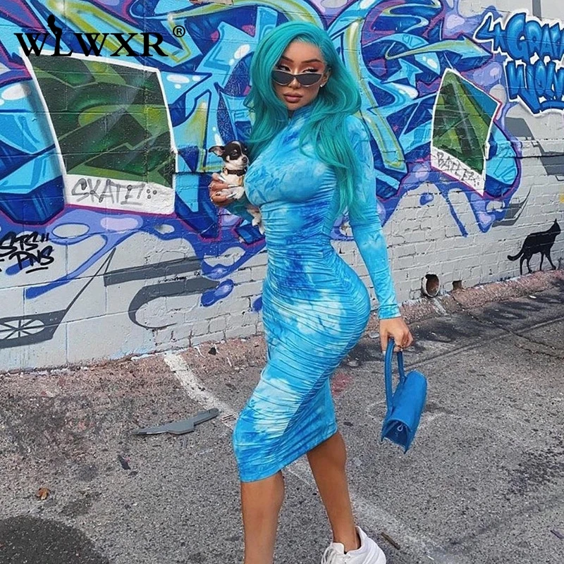 WLWXR уличное сексуальное облегающее платье с принтом в виде галстука-красителя для женщин 2020 летнее платье средней длины с длинным рукавом для ночного клуба женское плиссированное платье с запахом