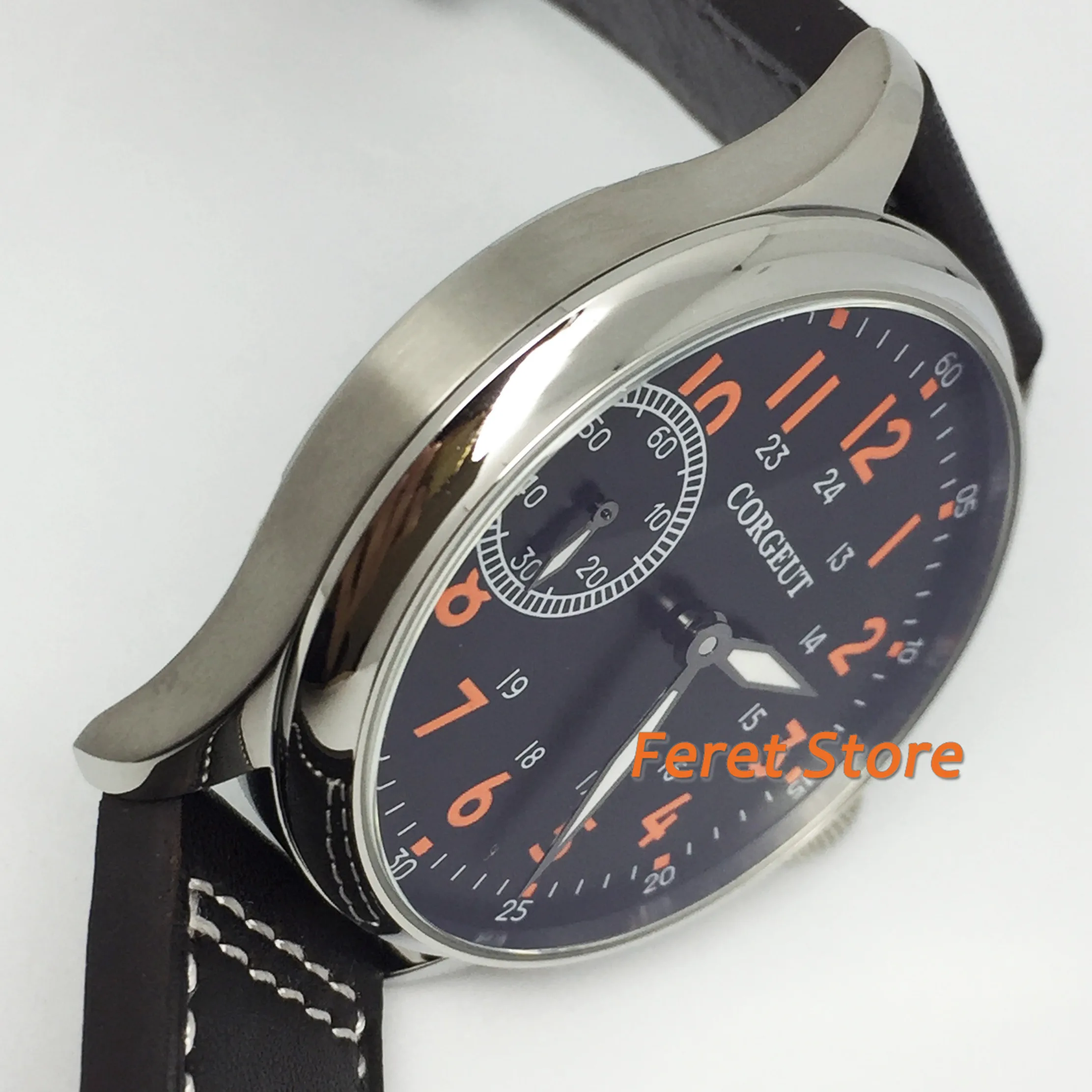 Механизм: механический (ручная обмотка) механизм 17 драгоценностей ручная обмотка 6497 механизм Циферблат: черный циферблат Диаметр корпуса: 44 мм чехол из нержавеющей стали Толщина корпуса: 12 мм Материал корпуса: твердый корпус из нержавеющей стали 316L Широкий ремешок: 22 мм черный кожаный ремешок Стекло: специальное устойчивое к царапинам минеральное стекло