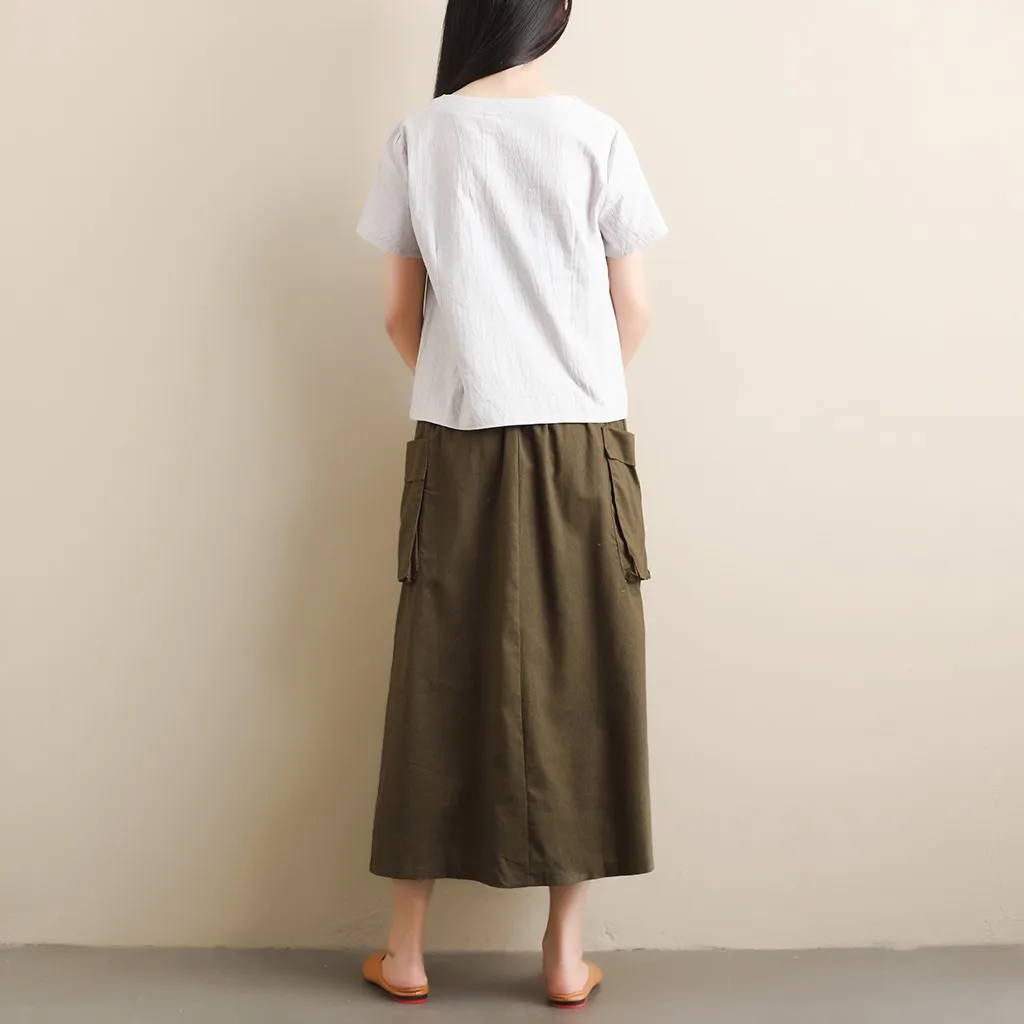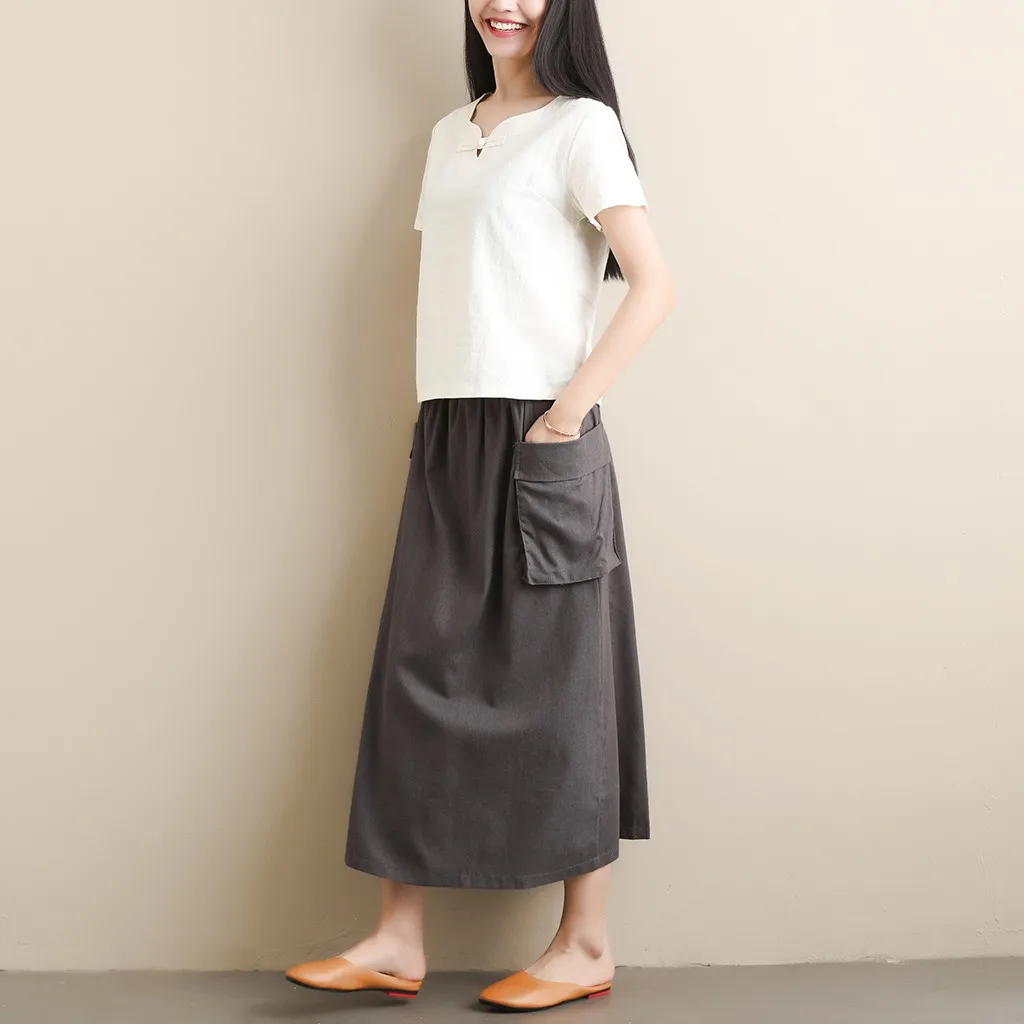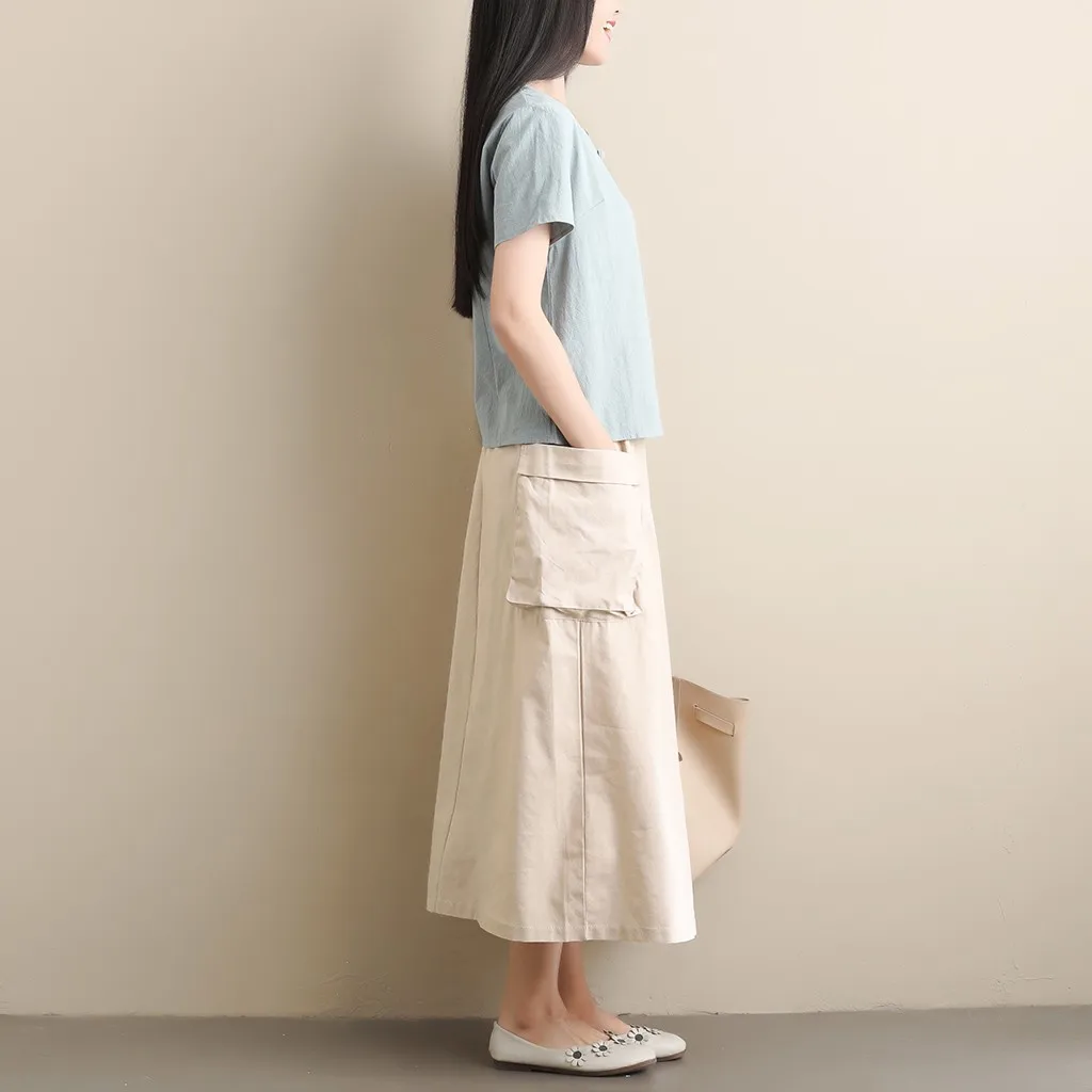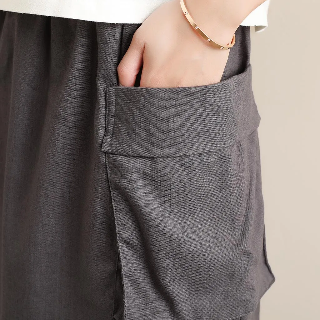Women's Retro Original Art LinenPocket Casual Pure Color Mid-Calf Skirt
