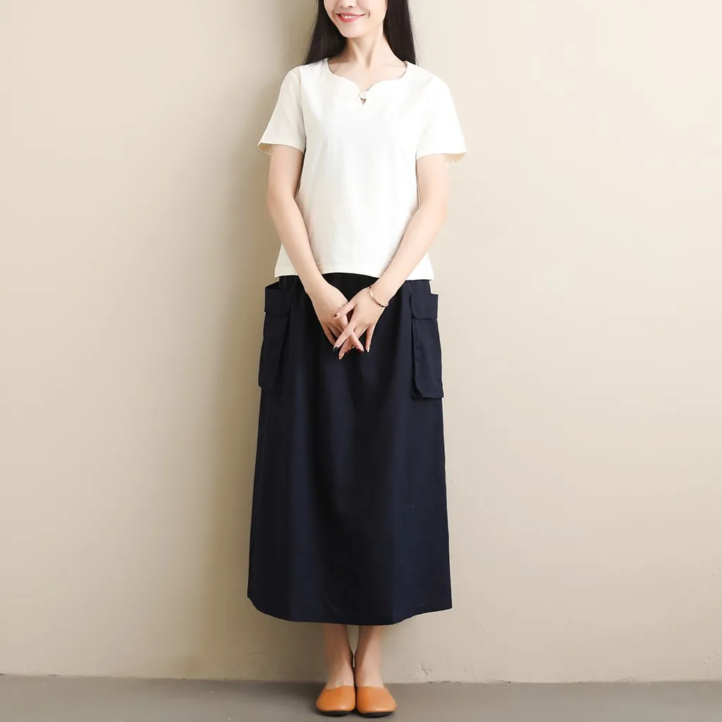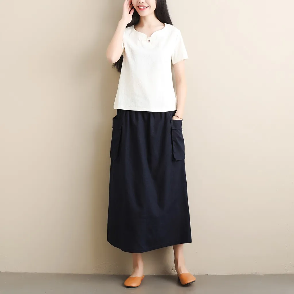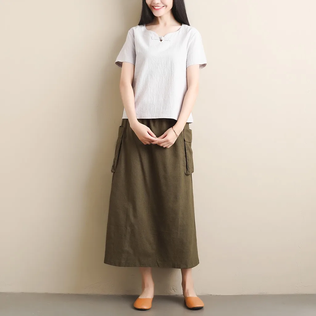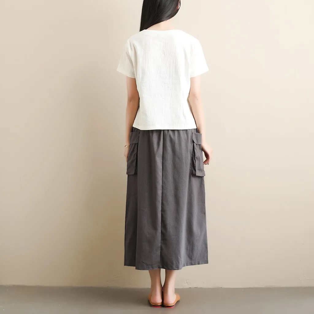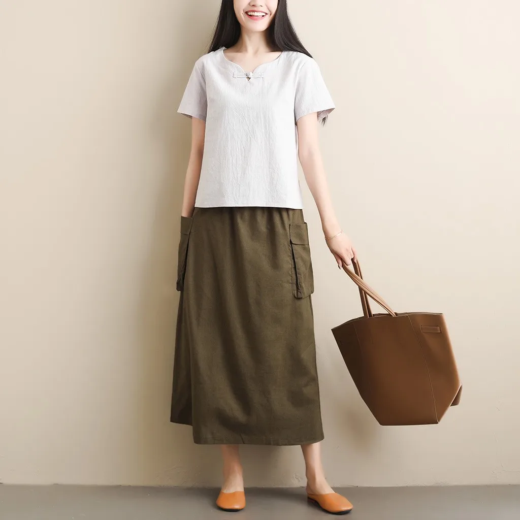 Women's Retro Original Art LinenPocket Casual Pure Color Mid-Calf Skirt