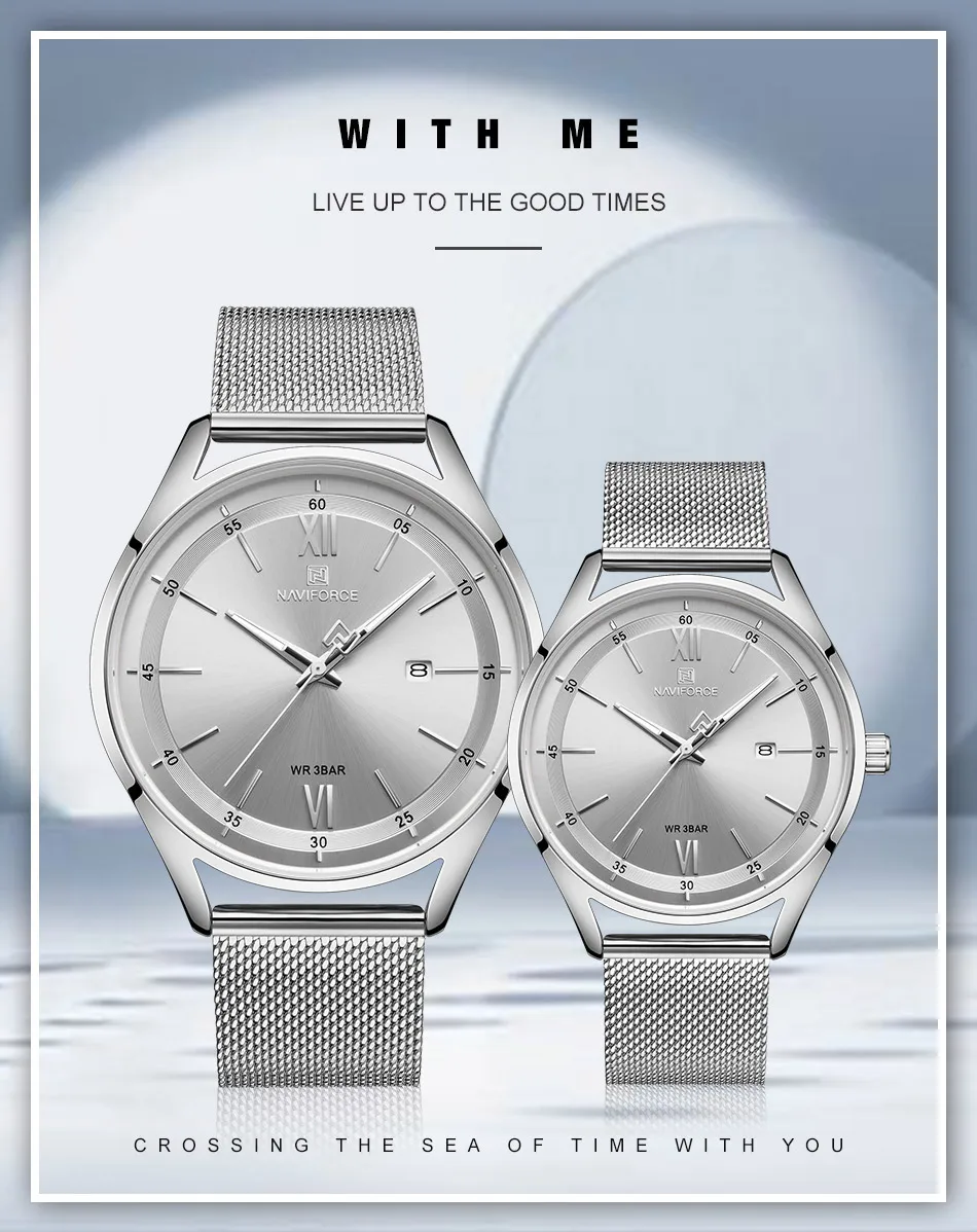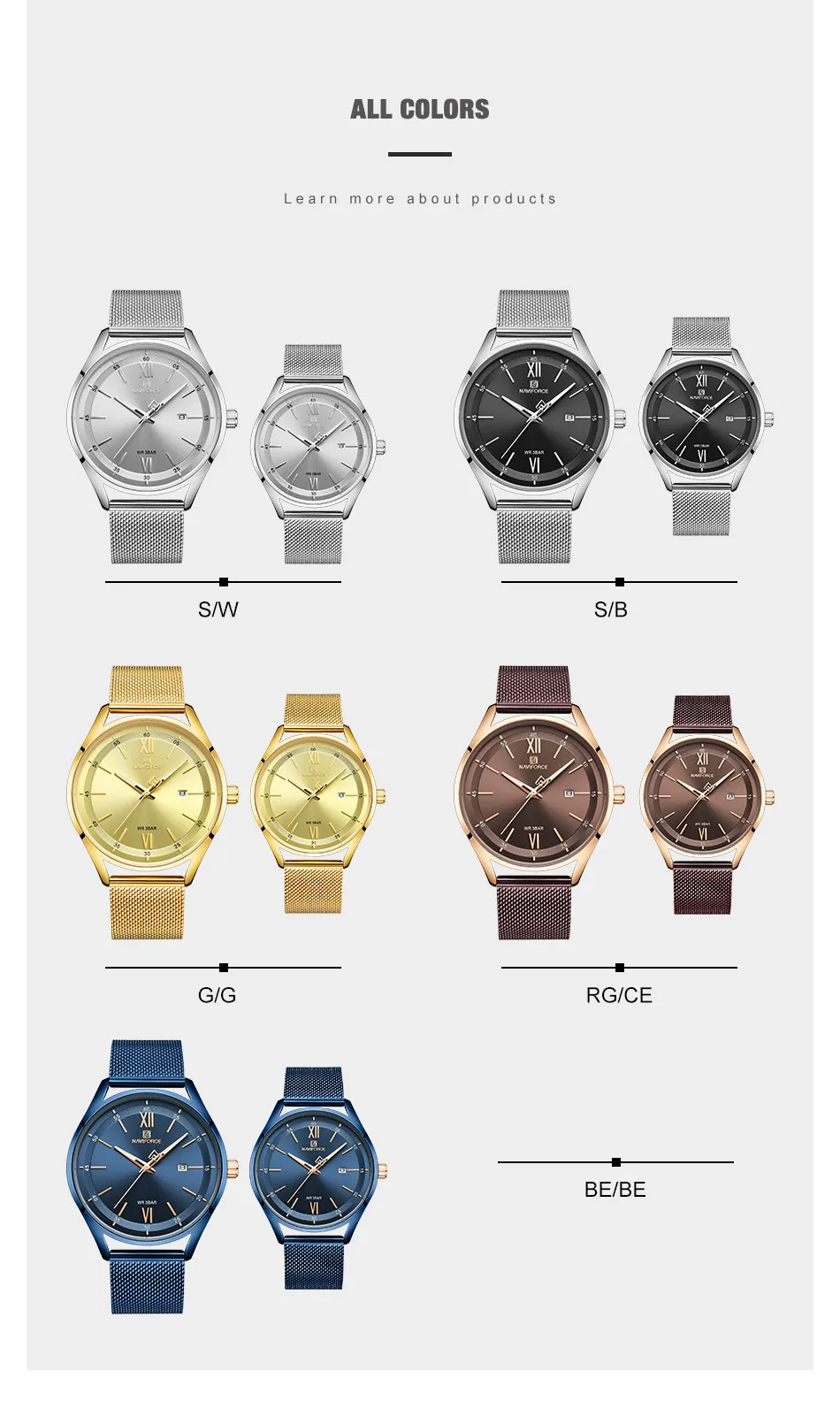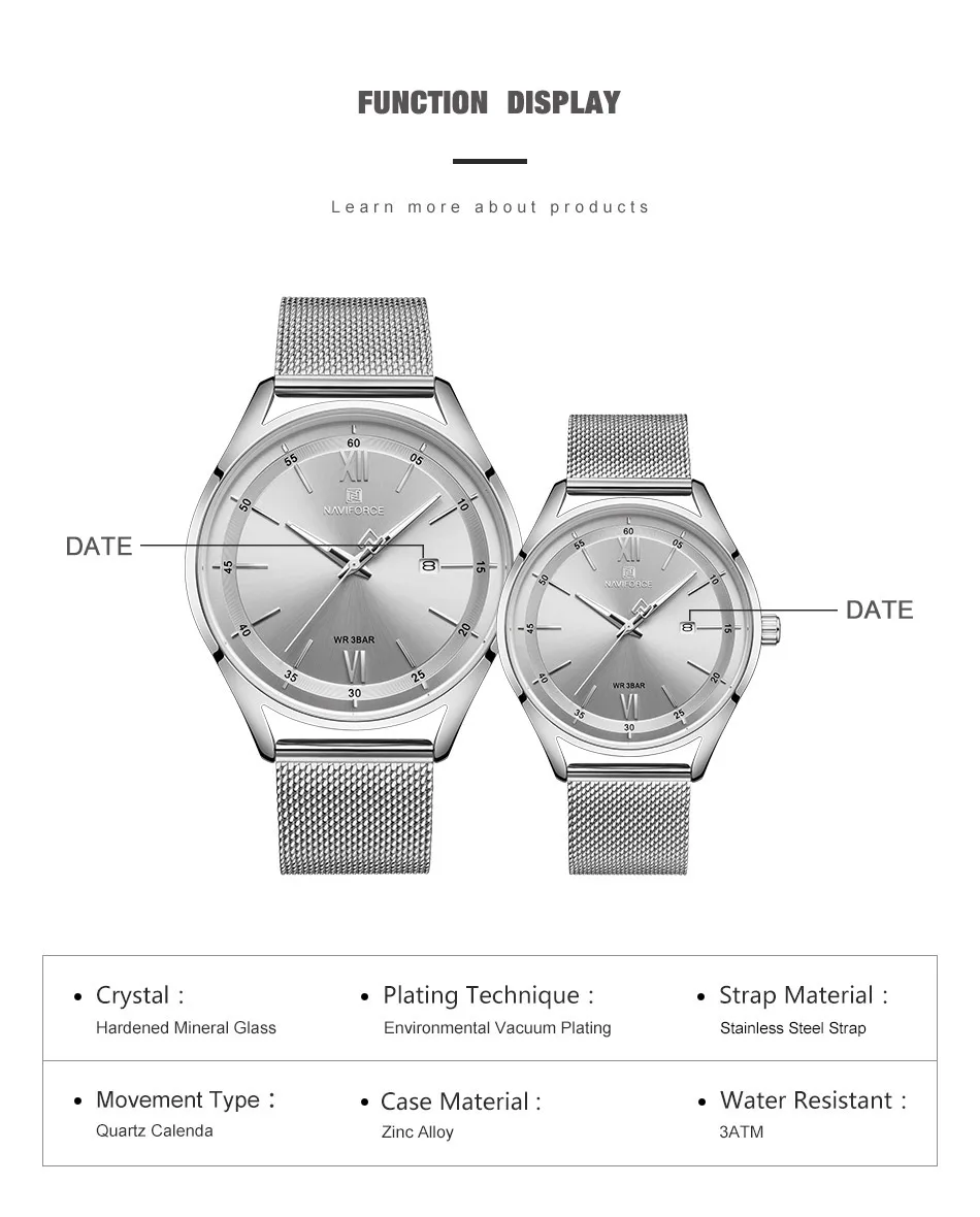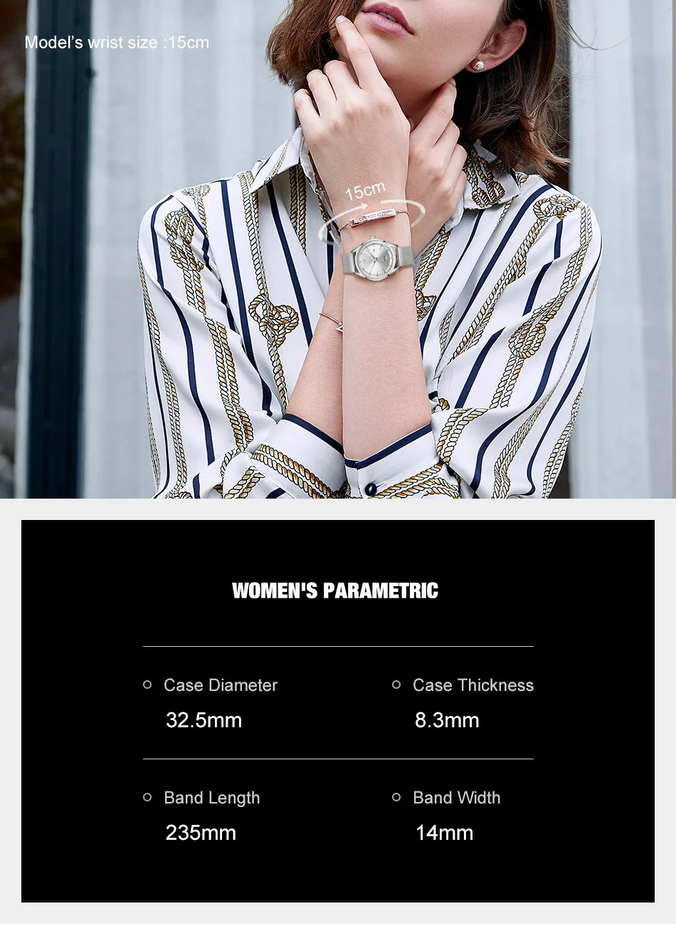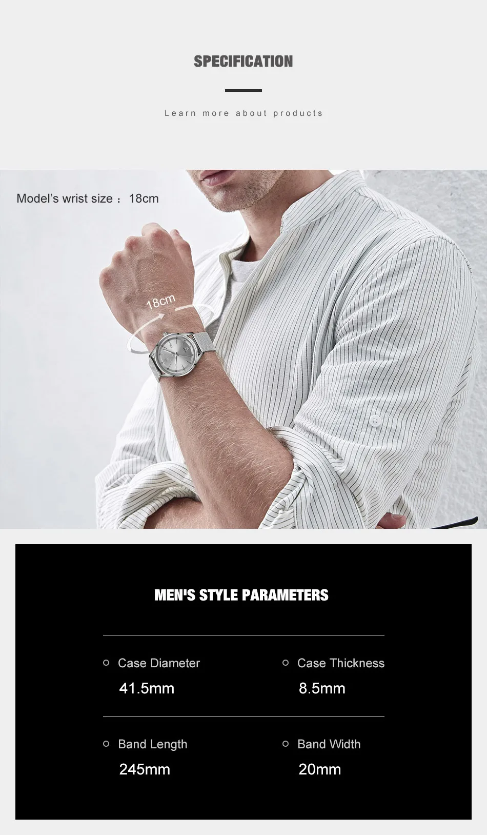 Case Material: Alloy Case Diameter: 41.5mm / 32.5mm Case Thickness: 8.5mm / 8.3mm Band Material: Mesh Steel strap Band Length: 245mm / 235mm (Cse Included) Band Width: 20mm / 14mm Weight : 72g / 46g