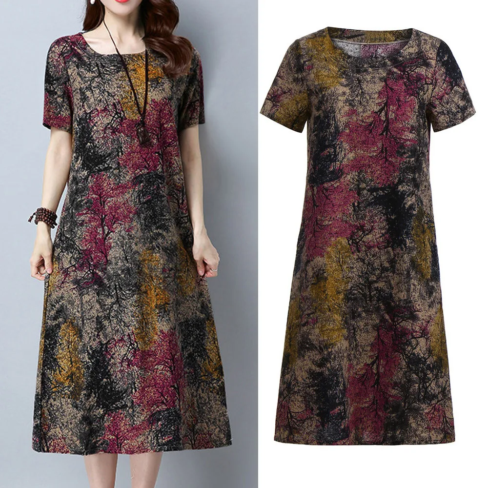 Модное женское свободное Повседневное платье из хлопка и льна с коротким рукавом и круглым вырезом