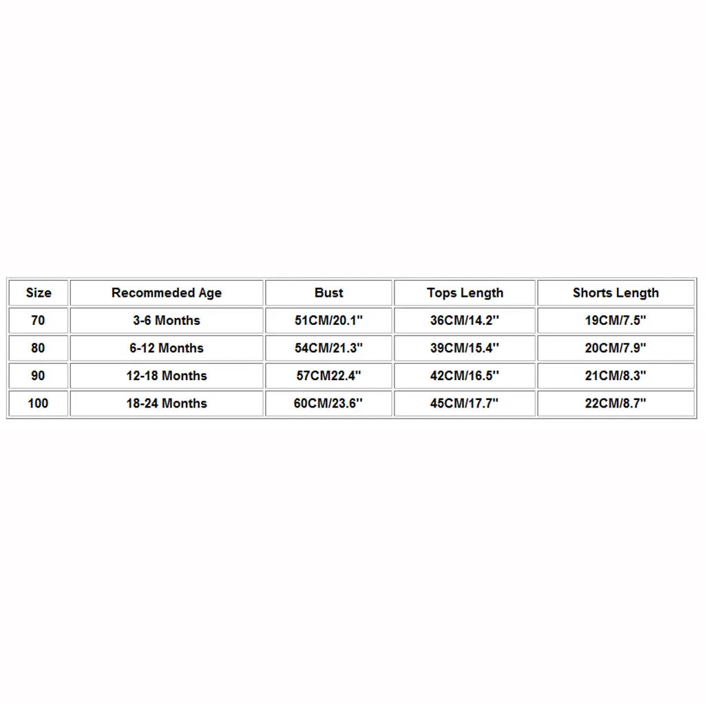 Размер Рекомендуемый возраст Бюст Длина топа Длина шорт 70 3-6 месяцев 51 см/20,1" 36 см/14,2'' 19 см/7,5 дюйма 80 6-12 месяцев 54 см/21,3" 39 см/15,4 дюйма 20 см/7,9 дюйма 90 12-18 месяцев 57CM22.4" 42 см/16,5 дюйма 21 см/8,3" 100 18-24 месяцев 60 см/23,6'' 45 см/17,7" 22 см/8,7"