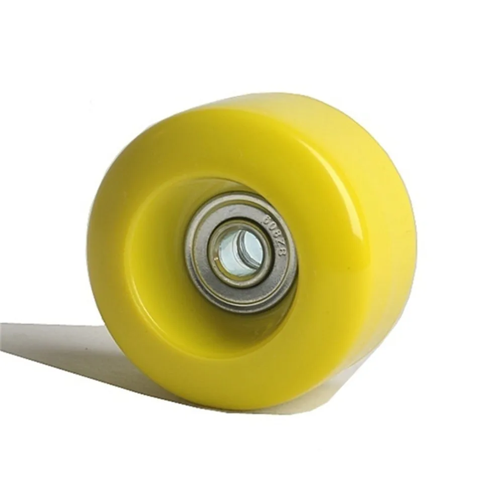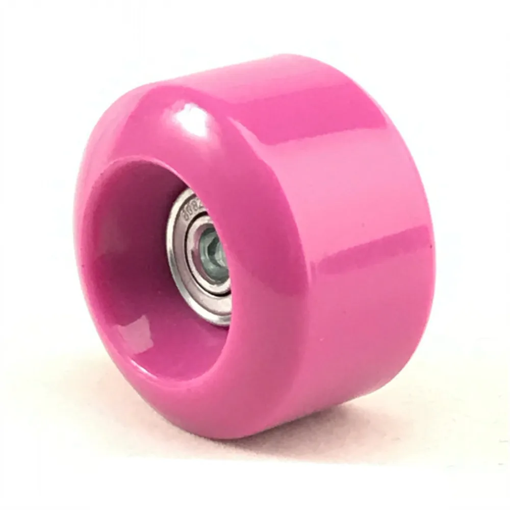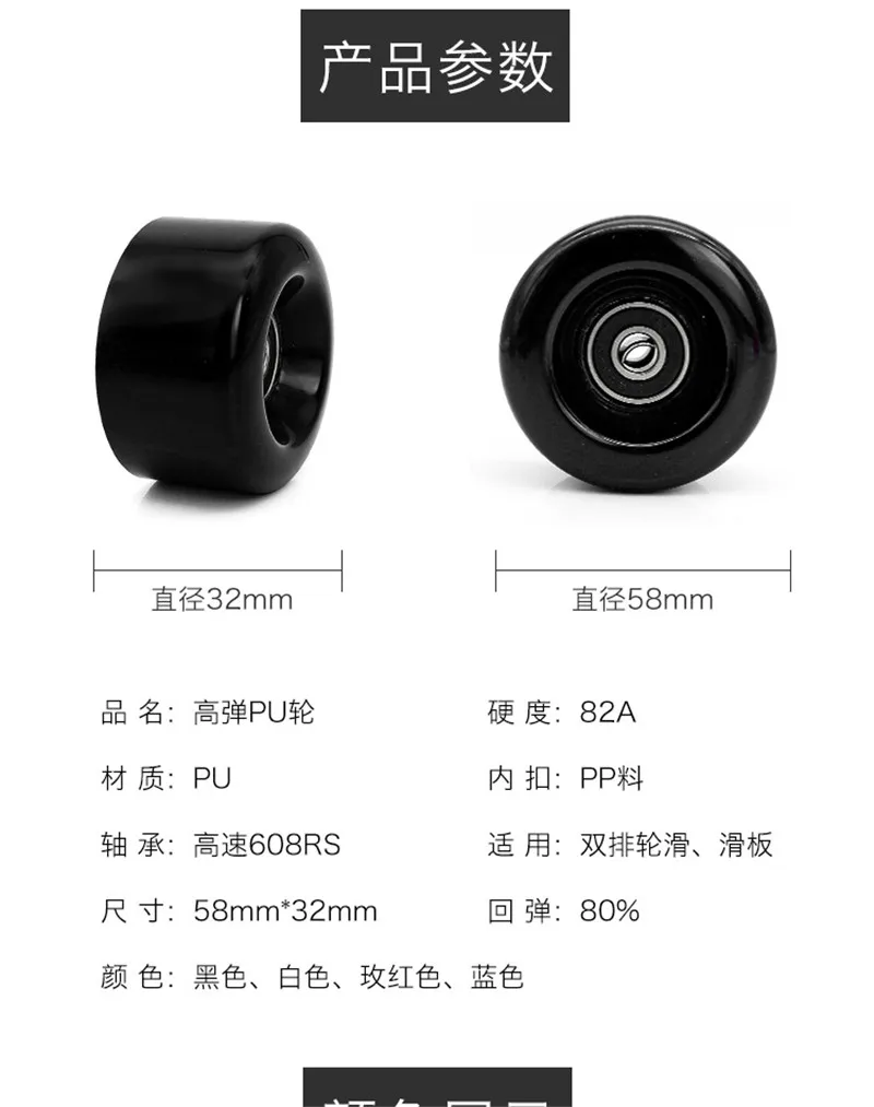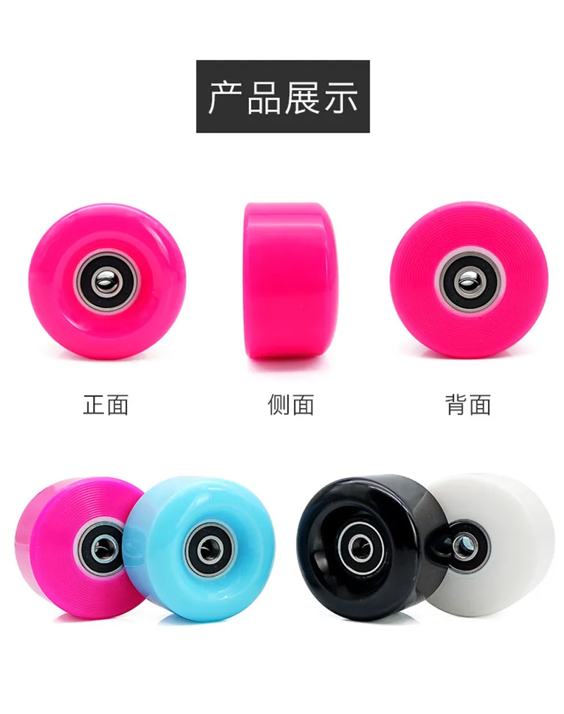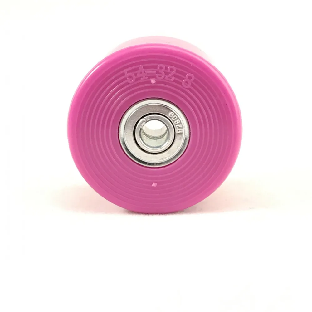 this wheel is with 54mm diamter and 32mm thickness; it use 608 standard bearing; you can choose black / pink / yellow color; the price is for 8 pieces wheels with bearings.