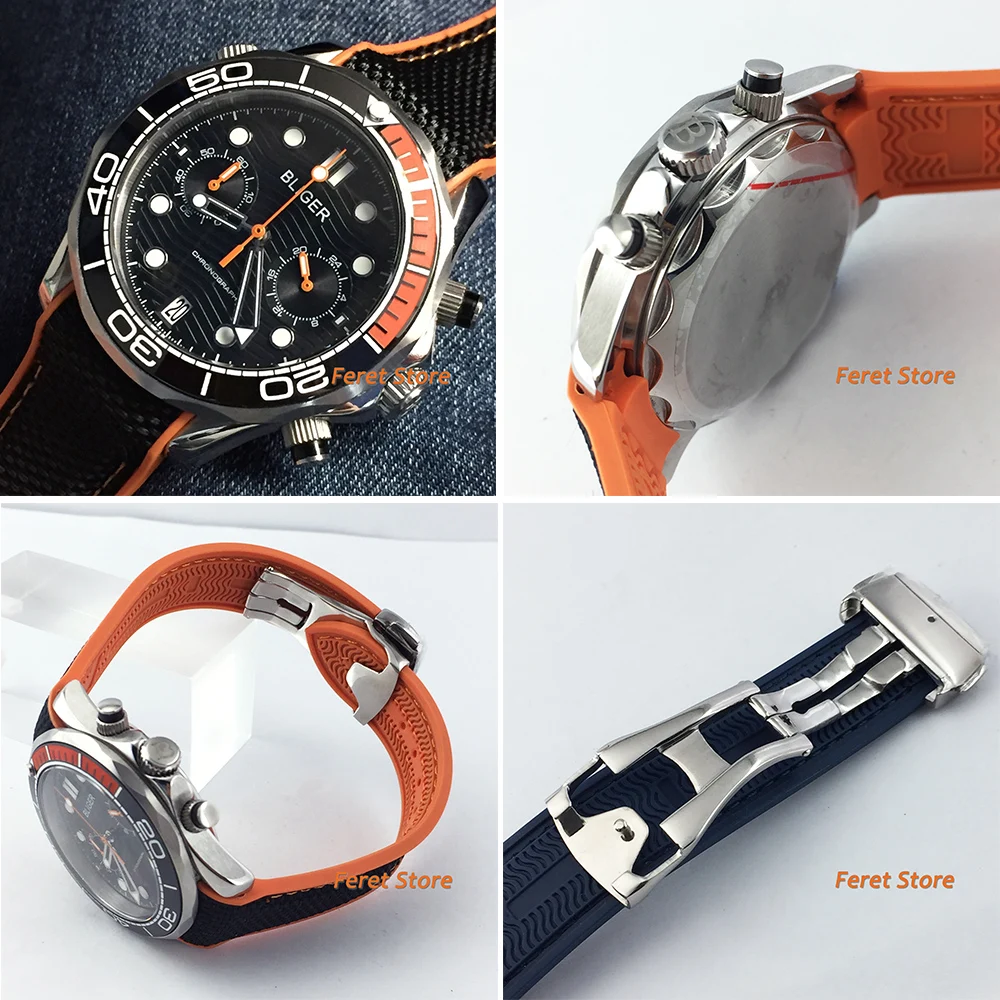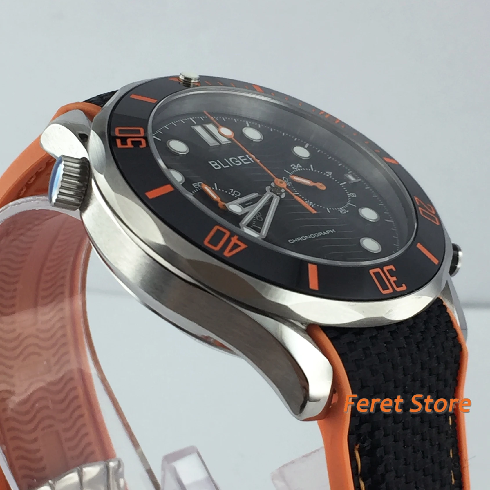 Механизм: кварцевый хронограф Чехол диаметр: 41 мм без короны Чехол Толщина: 14 мм Материал корпуса: твердый корпус из нержавеющей стали 316L с керамическим покрытием Ремешок: резиновый ремешок 20 мм Стекло: сапфировое стекло Функция: Кнопка нажатия при запуске/остановке хронографа 2:00 Хронограф с кнопочной кнопкой на 4:00 Минутная стрелка хронографа на 9:00 часов 24 часа в 3 часа Дата в 6 часов