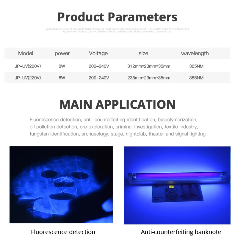 Черная инспекционная трубка изготовлена из сине-черного стекла, а внутренняя стенка трубы покрыта фосфором. Светильник, генерируемый этим типом светильник, излучается только в диапазоне ультрафиолетовых волн 300-400 нм, а его центральное значение составляет 365 нм, что может Невидимый ультрафиолетовый светильник. Излучение преобразуется в видимый светильник, так называемый флуоресцентный эффект, поэтому они подходят для всех применений, связанных с флуоресцентным анализом.