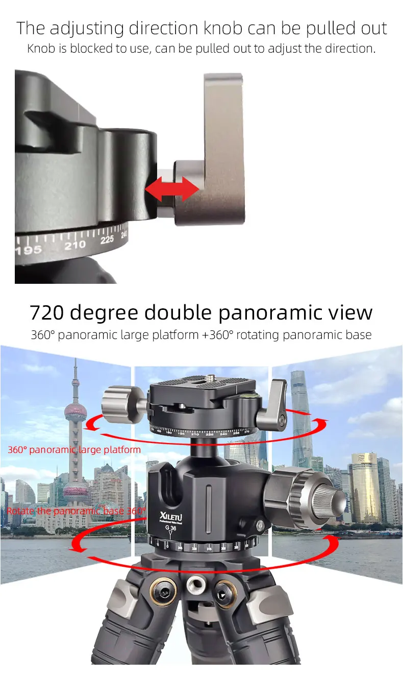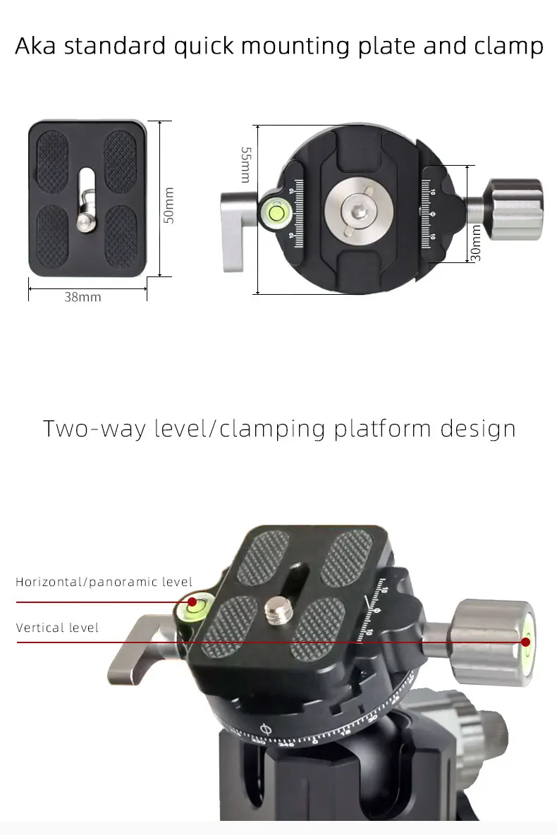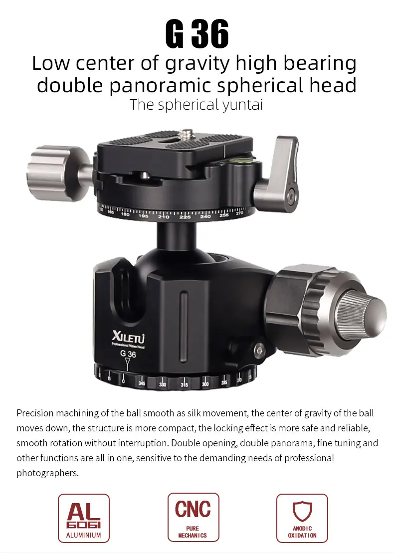 1.G-36 шаровая Головка для штатива принимает цельнометаллический процесс с ЧПУ, дизайн большого шара диаметром 36 мм, общая прочная и тяжелая нагрузка, максимальная грузоподъемность достигает 39,68 фунтов/18 кг, может поддерживать большие Объективы для камеры 2. На G-36 шаровой головке штатива есть два пузырька, очень удобно управлять уровнем вертикального угла, более гибкая работа 3. Верхняя часть G-36 шаровой головки штатива-это стандартный винт 1/4 ", совместимый с камерами DSLR Nikon Canon Sony Samsung и т. Д. Нижняя часть шаровой головки штатива B36N-это 3/8" Женская резьба, совместимая с моноподом для камеры и т. д., диаметр дна: 57 мм, размер быстроразъемной пластины: 38*50 мм (стандарт ARCA SWISS) 4.G-36 шаровая Головка штатива принимает 360 градусов панорамный дизайн, основание с точной шкалой, легко установить угол съемки быстро