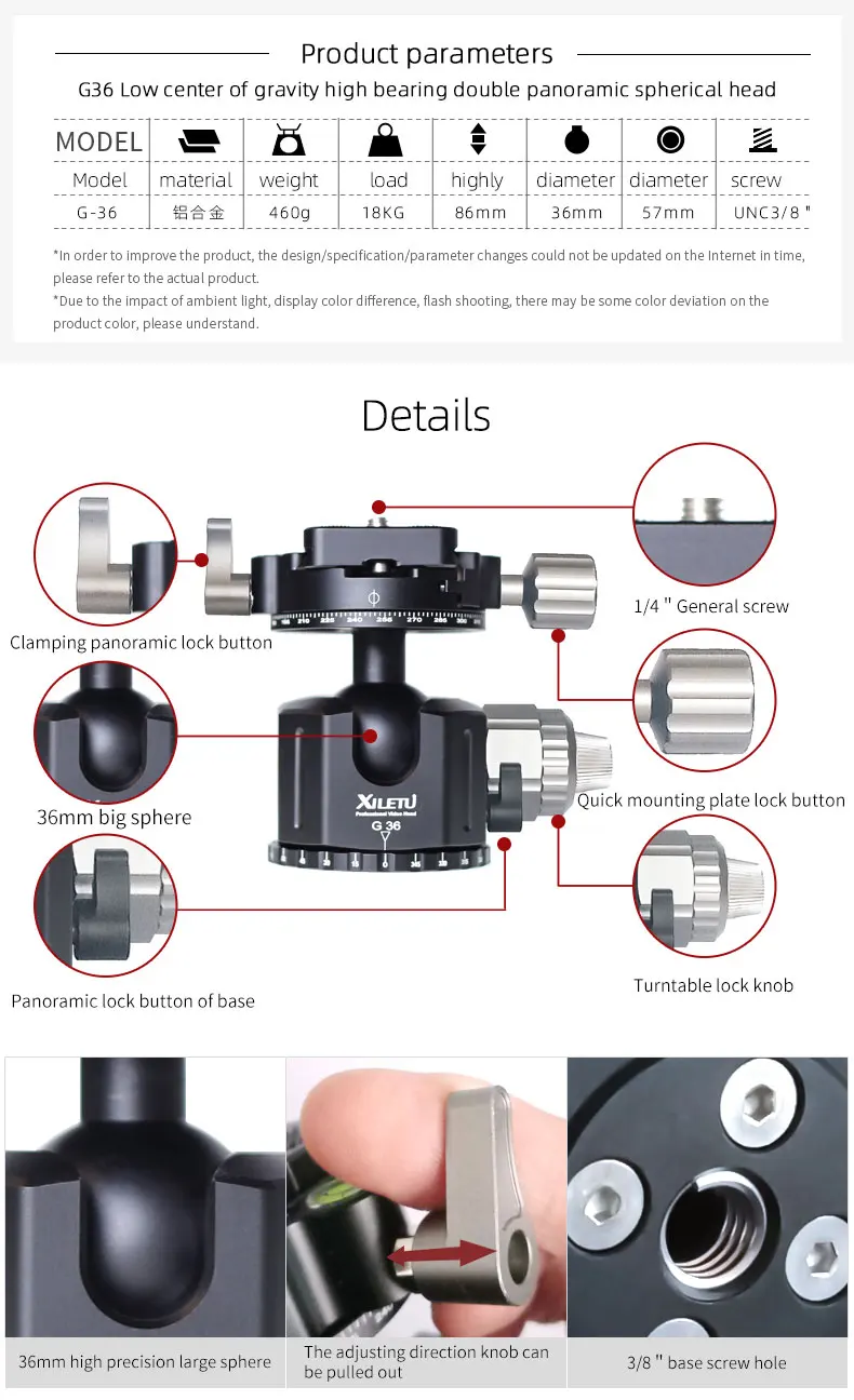 Бренд: XILETU Модель: G-36 Материал: алюминиевый сплав Вес изделия: 460 г Вес нагрузки: 18 кг Высота: 86 мм Диаметр шара: 36 мм Диаметр основания: 57 мм Отверстие для основного винта: 3/8 ″
