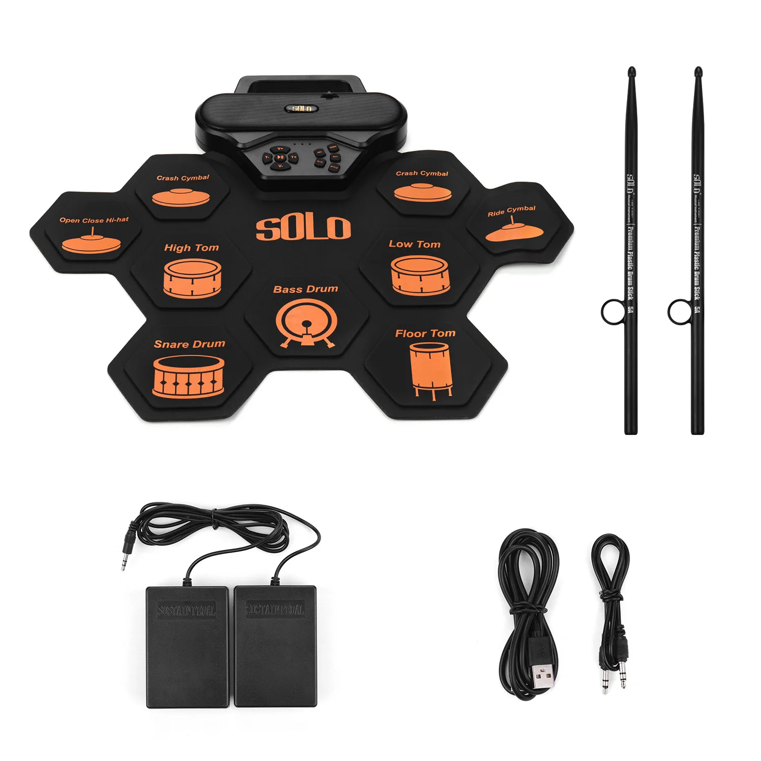 С 9 барабанными подушечками, включая 2 * crash cymbal, 1 * open close hi-hat, 1 * high Tom drum, 1 * low Tom drum, 1 * ride cymbal, 1 * барабан snare, 1 * басовый барабан, 1 * напольный барабан, обеспечивающий отличные звуки барабана; Поддерживает подключение ножной педали, чтобы сделать вас играть более гибкими.