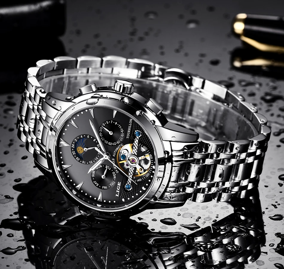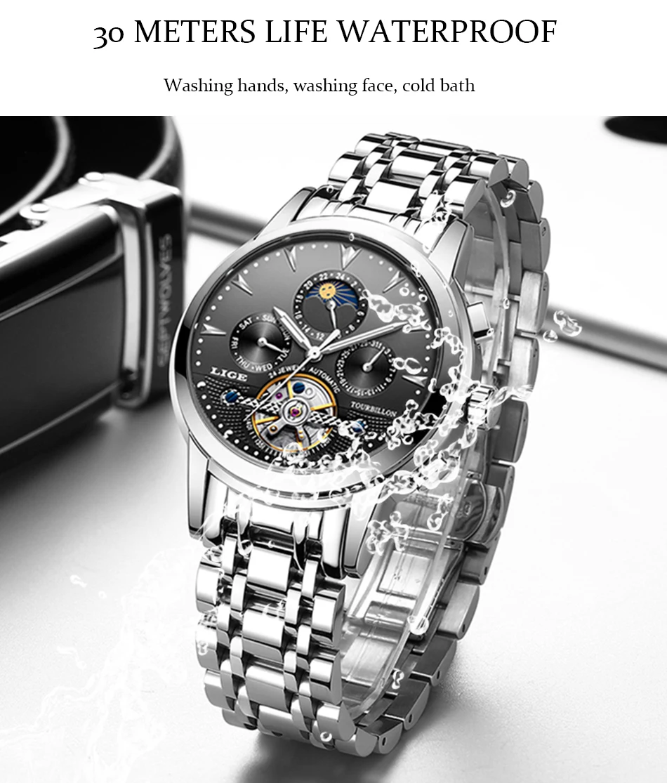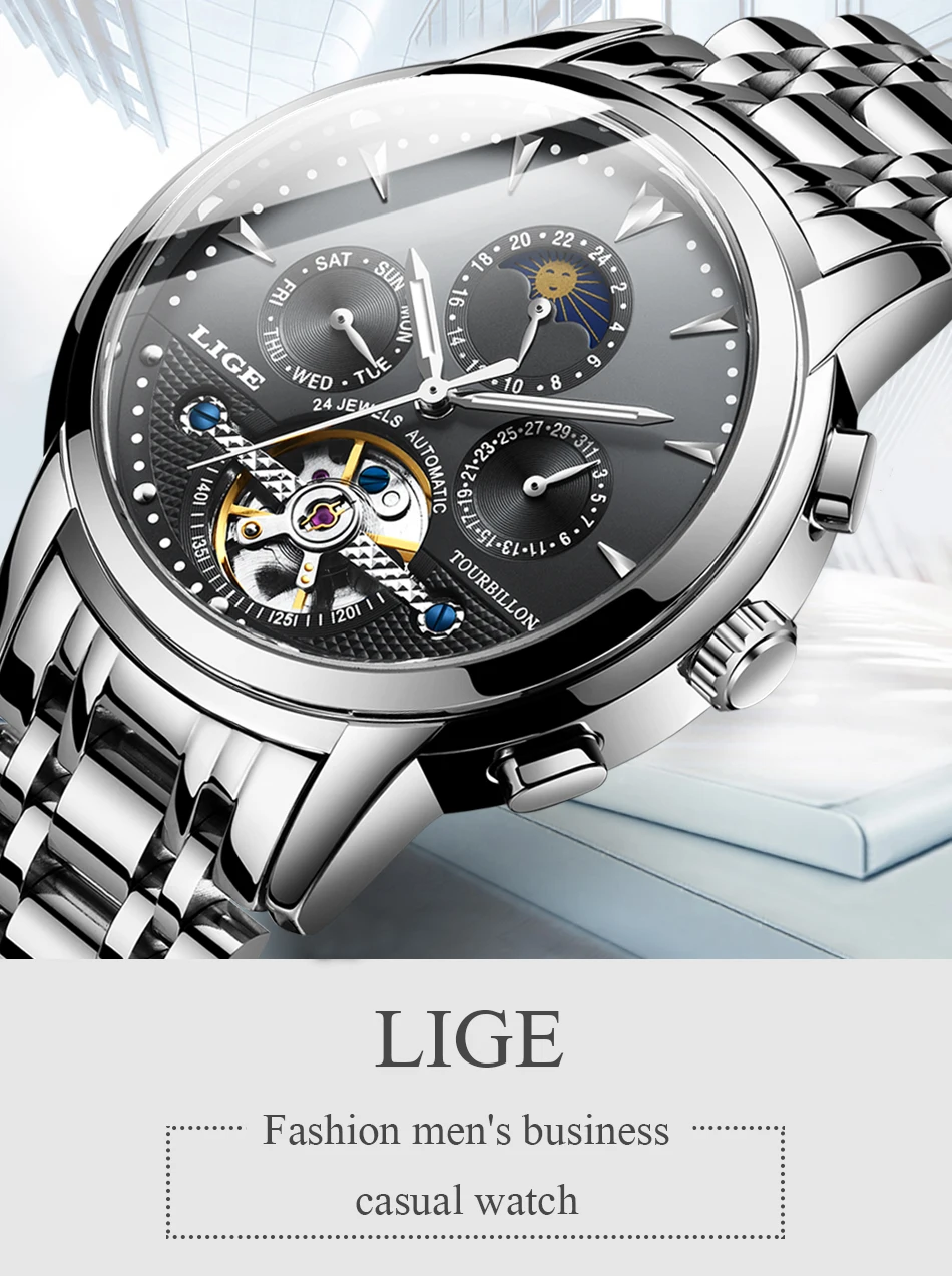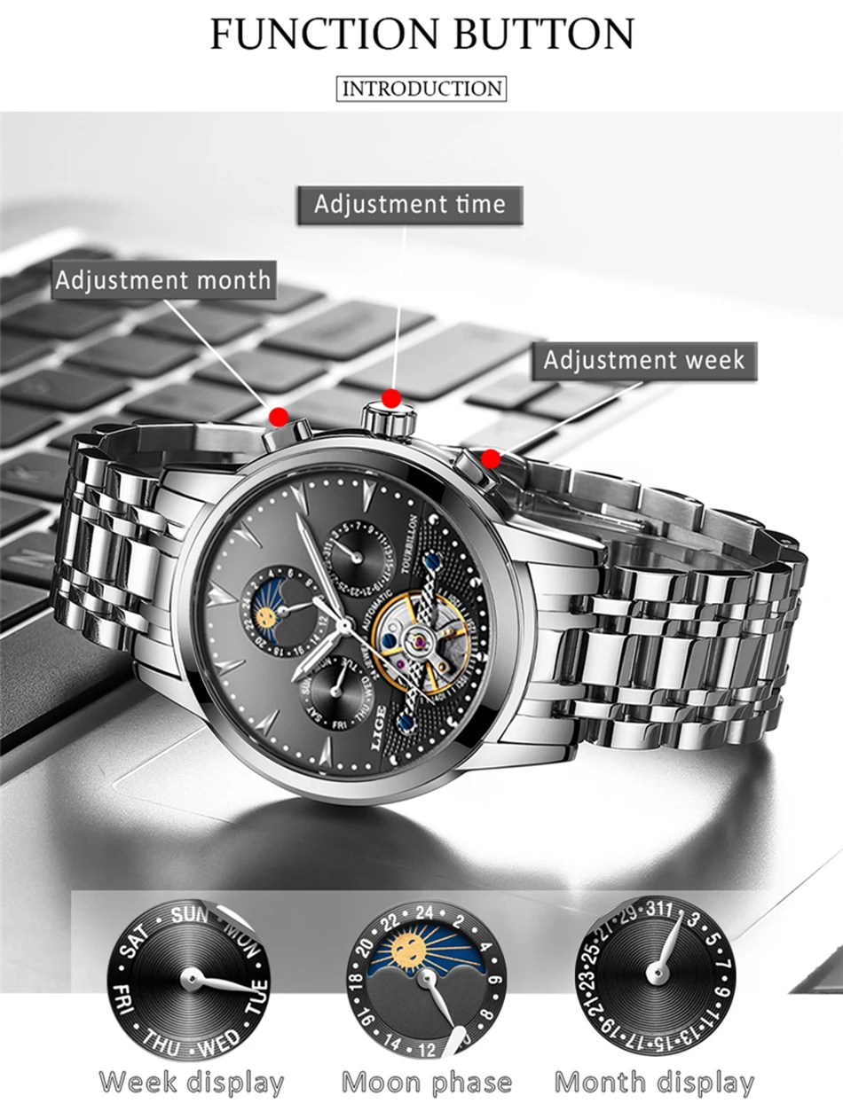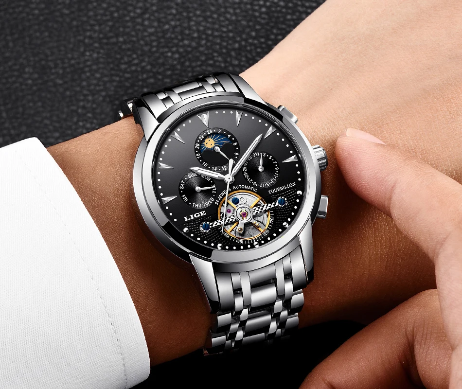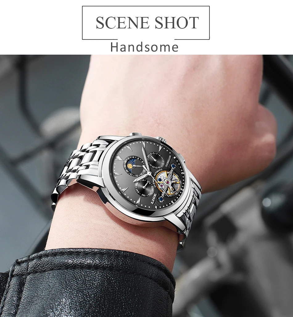 Men's fully automatic mechanical watches are equipped with a week, month, date, and moon phase functions that do not require batteries to rely on training to enhance energy.Watch lenses are a mineral high-precision glass-blue-coated to protect the eyes from scratches.The shell is made of stainless steel plus stainless steel, which is resistant to abrasion and scratches.Automatic watches do not contain batteries and are made of mechanical parts and gears. Powered by the movement of your wrist when you wear it. To operate the watch, to send it, turn the button clockwise for 15 to 20 cycles.This is the perfect gift for a watch business negotiation, work, travel, party, birthday party, birthday gift at the same time.