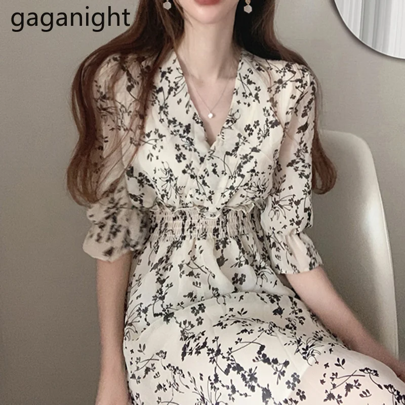 Gaganight Women Retro Floral Dress Cross V Neck Wooden Ear Slim Long Vestido Summer Elegant Chiffon Short Sleeve Dresses Femme