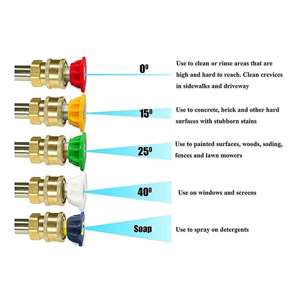 Сопло Технические характеристики: Черная мыльная насадка изготовлена из латуни, другие цвета наконечники распылителя Из нержавеющей стали. Насадки для мойки с различными рисунками распыления. (Красный Один 0 °, желтый один 15 °, зеленый один 25 °, белый один 40 °, черный один 65 °) . Размер отверстия 2,5