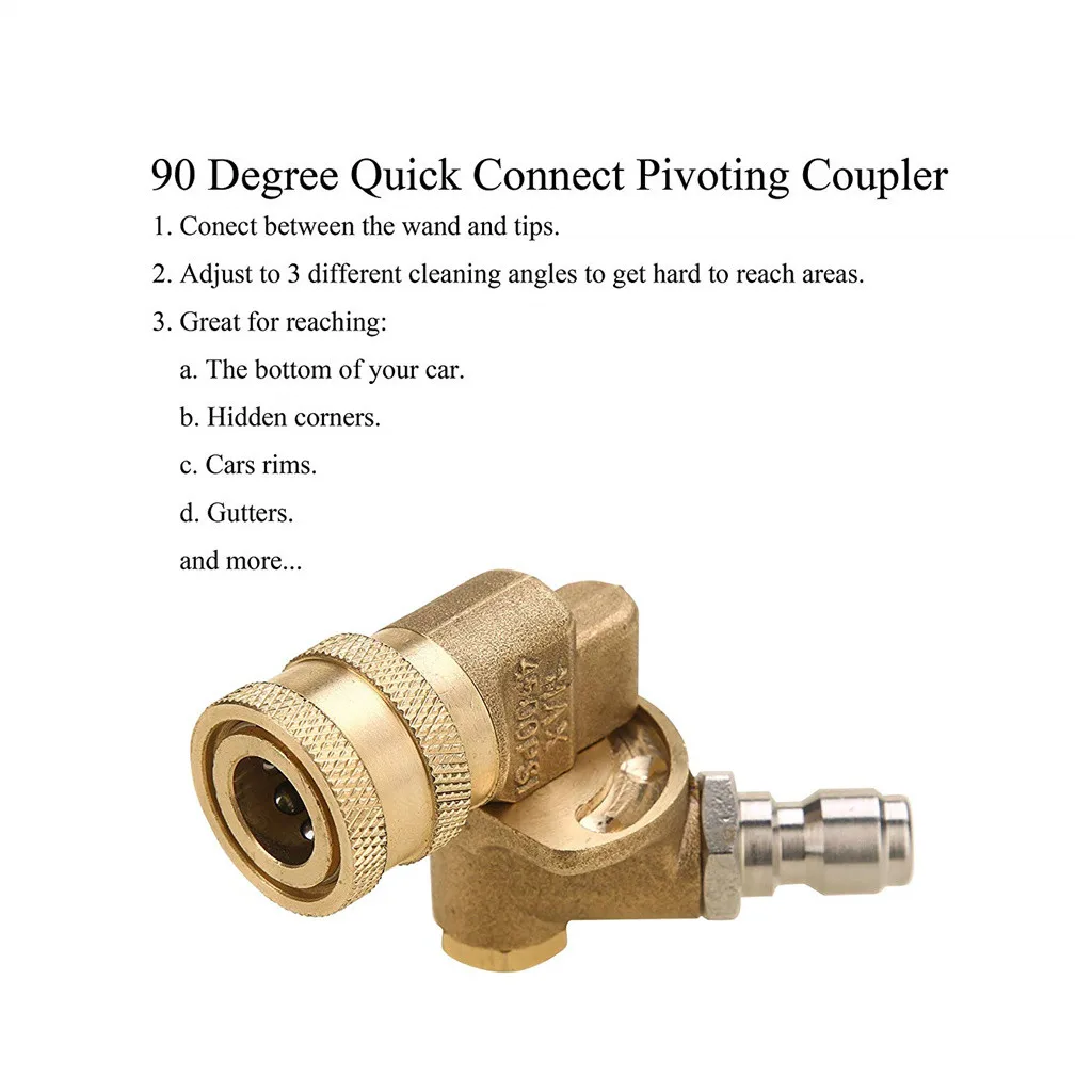 Поворотный соединитель Технические характеристики: Изготовлен из латуни, устойчив к окислению и коррозии. Регулируется на 90 градусов 3 различных направления очистки, до 4500 фунтов/кв. дюйм, 1/4 дюйма быстрая замена, Соединяется между палочкой и соплом высокого давления мойки высокого давления