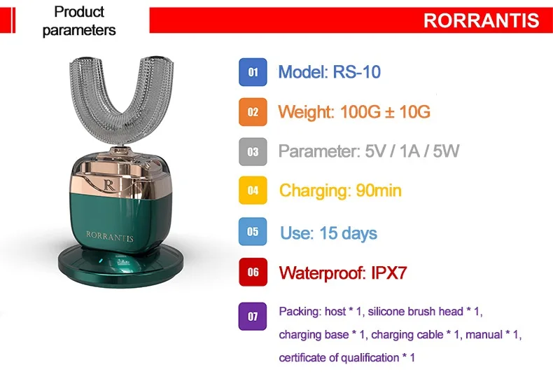 Модель продукта: RS10Вес изделия: 100 г ± 10 гНоминальная высокой интенсивности параметры: 5V / 1A5WПродолжительность: 15 днейВодонепроницаемость: Px7Упаковочный лист:Основной блок * 1, головка силиконовой щетки * 1, Зарядная база * 1, зарядный кабель * 1, руководство по эксплуатации * 1, сертификация * 1