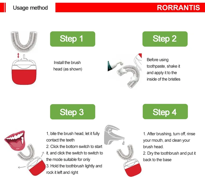 Метод использованияШаг 1: Установите головку кисти (как показано на рисунке)Шаг 2: Перед использованием зубной пасты встряхните ее и нанесите на внутреннюю часть щетиныШаг 3:1. Укусите головку кисти, дайте ей полностью связаться с зубами2. Нажмите нижний переключатель, чтобы начать его, и нажмите переключатель, чтобы переключиться в режим, подходящий только для3. Слегка удерживайте зубную щетку и раскачивайте ее влево и вправоШаг 4:1. После чистки, выключите краску и очистите щетку.2. Высушите зубную щетку и положите ее обратно в основание
