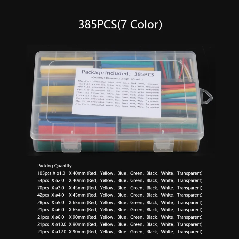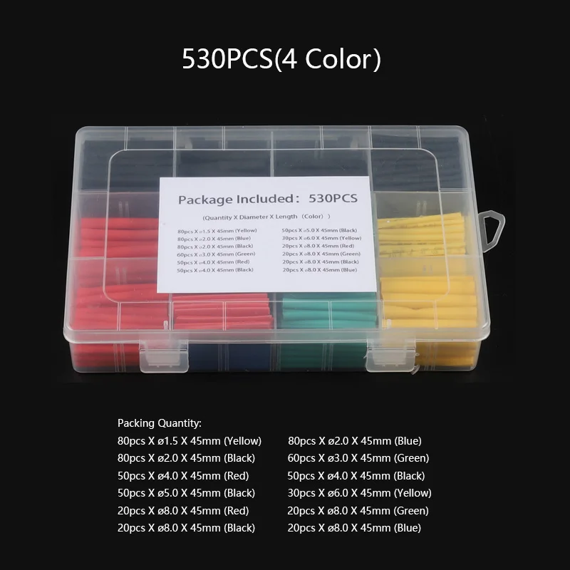 Набор термоусадочных труб из полиолефина разных цветов в штучной упаковке Термоусадочная трубка в коробке 14 спецификаций, 6 цветов Внутренний диаметр: 1,0 мм, 1,5 мм, 2,0 мм, 2,5 мм, 3,0 мм, 3,5 мм, 4,0 ММ, 5,0 мм, 6,0 мм, 7 мм, 8,0 мм, 10,0 мм, 13,0 мм, 14,0 мм Материал: Полиолефин Рабочая температура: от-55 °C до + 125 °C Минимальная температура усадки: + 70 °C Полная Температура усадки: + 110 °C максимум Прочность на растяжение: 10,4 МПа Диэлектрическая прочность: 15 кВ/мм Воспламеняемость: огнестойкость Утверждения: UL 100 шт. (тип A): 30 шт. X ø1.5X100 мм (черный) 30 шт. X ø2.5X100 мм (желтый) 20 шт. X ø4.0X100 мм (красный) 10 шт. X ø6.0X100 мм (зеленый) 6 шт. X ø10.0X100 мм (синий) 4 шт. X ø13.0X100 мм (белый) 100 шт. (B Тип): 30 шт. X ø1.5X100 мм (белый) 30 шт. X ø2.5X100 мм (желтый) 20 шт. X ø4.0X100 мм (черный) 10 шт. X ø6.0X100 мм (зеленый) 6 шт. X ø10.0X100 мм (синий) 4 шт. X ø13.0X100 мм (красный) 280 шт. (5 цветов): 40 шт. X ø1.0X45 мм (желтый) 40 шт. X ø2.0X45 мм (синий) 40 шт. X ø2.0X45 мм (черный) 30 шт. X ø3.0X45 мм (зеленый) 25 шт. X ø4.0X45 мм (красный) 25 шт. X ø4.0X45 мм (черный) 20 шт. X ø5.0X45 мм (черный) 20 шт. X ø6.0X45 мм (желтый) 10 шт. X ø8.0X45 мм (красный) 10 шт. X ø10. X 45 мм (зеленый) 10 шт. X ø10.0X45 мм (синий) 10 шт. X ø10.0X45 мм (зеленый) 328 шт. (5 цветов): 120 шт. X ø1.0X40 мм (желтый, черный, красный, зеленый) 60 шт. X ø2.0X40 мм (желтый, черный, красный, синий) 40 шт. X ø3.0X40 мм (желтый, черный, красный, зеленый) 32 шт. X ø4.0X40 мм (желтый, черный, красный, синий) 24 шт. X ø6.0X40 мм (желтый, черный, красный, зеленый) 20 шт. X ø8.0X80 мм (желтый, черный, красный, синий) 16 шт. X ø10.0X80 мм (желтый, черный, красный, зеленый) 16 шт. X ø14.0X80 мм (желтый, черный, красный, синий) 385 шт. (7 цветов): 105 шт. X ø1.0X40 мм (красный, желтый, синий, зеленый, черный, белый, прозрачный) 54 шт. X ø2.0X40 мм (красный, желтый, синий, зеленый, черный, белый, прозрачный) 70 шт. X ø3.0X45 мм (красный, желтый, синий, зеленый, черный, белый, прозрачный) 42 шт. X ø4.0X45 мм (красный, желтый, синий, зеленый, черный, белый, прозрачный) 28 шт. X ø5.0X65 мм (красный, желтый, синий, зеленый, черный, белый, прозрачный) 21 шт. X ø6.0X65 мм (красный, желтый, синий, зеленый, черный, белый, прозрачный) 21 шт. X ø8.0X90 мм (красный, желтый, синий, зеленый, черный, белый, прозрачный) 21 шт. X ø10.0X90 мм (красный, желтый, синий, зеленый, черный, белый, прозрачный) 21 шт. X ø12.0X90 мм (красный, желтый, синий, зеленый, черный, белый, прозрачный) 530 шт. (4 цвета): 80 шт. X ø1.5X45 мм (желтый) 80 шт. X ø2.0X45 мм (синий) 80 шт. X ø2.0X45 мм (черный) 60 шт. X ø3.0X45 мм (зеленый) 50 шт. X ø4.0X45 мм (красный) 50 шт. X ø4.0X45 мм (черный) 50 шт. X ø5.0X45 мм (черный) 30 шт. X ø6.0X45 мм (желтый) 20 шт. X ø8.0X45 мм (красный) 20 шт. X ø8.0X45 мм (зеленый) 20 шт. X ø8.0X45 мм (черный) 20 шт. X ø8.0X45 мм (синий) 560 шт. (4 цвета): 90 шт. X ø1.0X45 мм (черный) 70 шт X ø1.5X45 мм (красный) 80 шт. X ø2.0X45 мм (желтый) 70 шт X ø2.5X45 мм (зеленый) 50 шт. X ø3.0X45 мм (черный) 45 шт. X ø3.5X45 мм (синий) 45 шт. X ø4.0X45 мм (красный) 20 шт. X ø5.0X45 мм (синий) 20 шт. X ø6.0X45 мм (синий) 25 шт. X ø7.0X45 мм (красный) 25 шт. X ø10.0X45 мм (черный) 20 шт. X ø13.0X45 мм (черный)