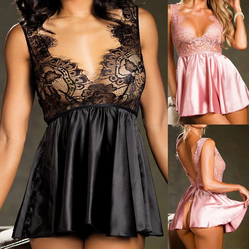 Женское нижнее белье Babydoll пижама из искусственного шелка кофточка от пижамы лоскутное нижнее белье кружевное платье