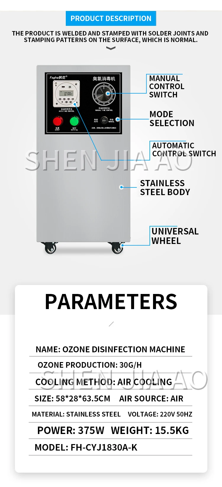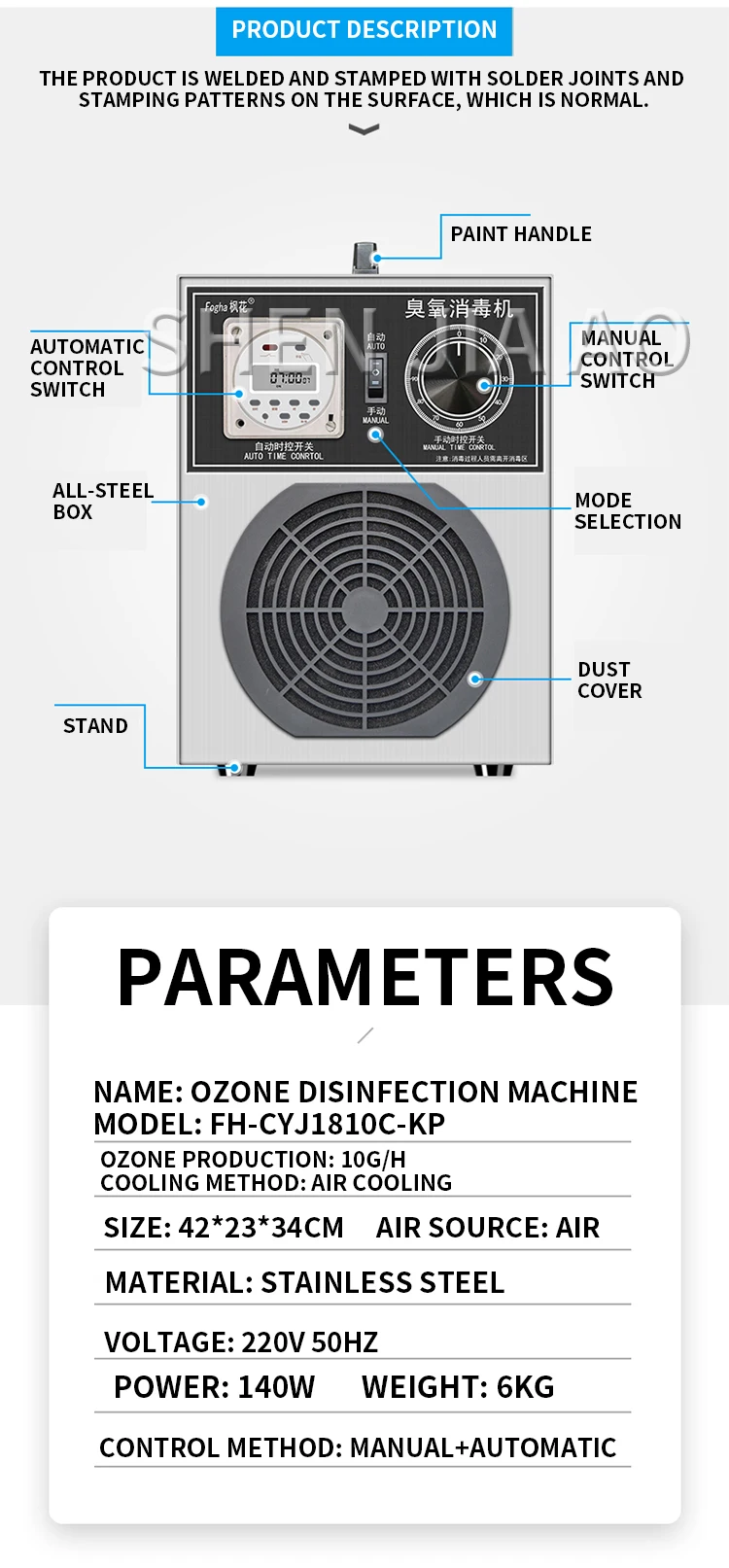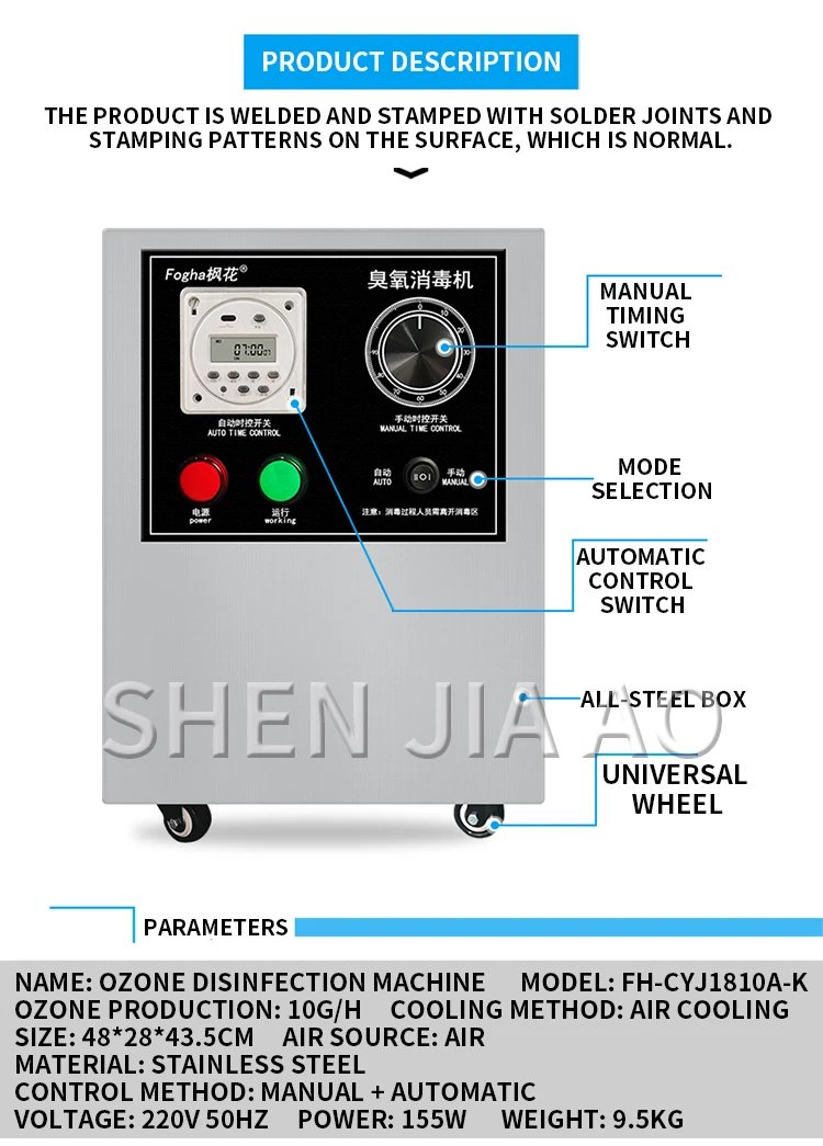 Наименование: машина для дезинфекции озона Модель: FH-CYJ1810A-K Производство озона: 10 Гц/ч Метод охлаждения: воздушное охлаждение Размер: 48*28*43,5 см Источник воздуха: воздух Материал: нержавеющая сталь Метод управления: ручной + автоматический Напряжение: 220 В 50 Гц Мощность: 155 Вт Вес: 9,5 кг