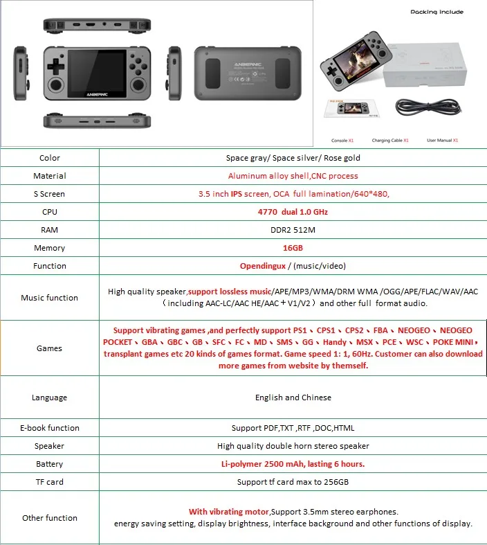 RG350M поддерживает выход HDMI TV! ! 2020 обновленная версия RG350M Linux Системы чехол для телефона в виде ретро-игровой консоли Алюминий корпус из металлического сплава 3,5 "с полным обзором IPS Экран PS1 эмулятор игровых автоматов DIY RG350 Game Player RG350M: DIY игровая консоль Linux System Улучшенная версия, игровой опыт намного лучше. Процессор: JZ4770 двойной 1,0 ГГц. Оперативная память: 512M DDR2 С вибрационных моторов, Поддержка 3,5 мм стерео наушники. Литий-полимерный аккумулятор 2500 мА · ч, длится 6 часов. RG350M с системой Linux с открытым исходным кодом, часть функции предназначена для профессионального игрока, если клиент хочет сделать это самостоятельно, пожалуйста, научите это. Функция HDMI не может работать сейчас, улучшит эту функцию в ближайшее время. Ретро Игровая приставка RG350M и RG350 RG350-полноэкранный IPS-экран, пластиковый корпус. RG350M полностью ламинирует IPS-экран, корпус из алюминиевого сплава. Сумка Proction для RG350M и RG350 является универсальной.
