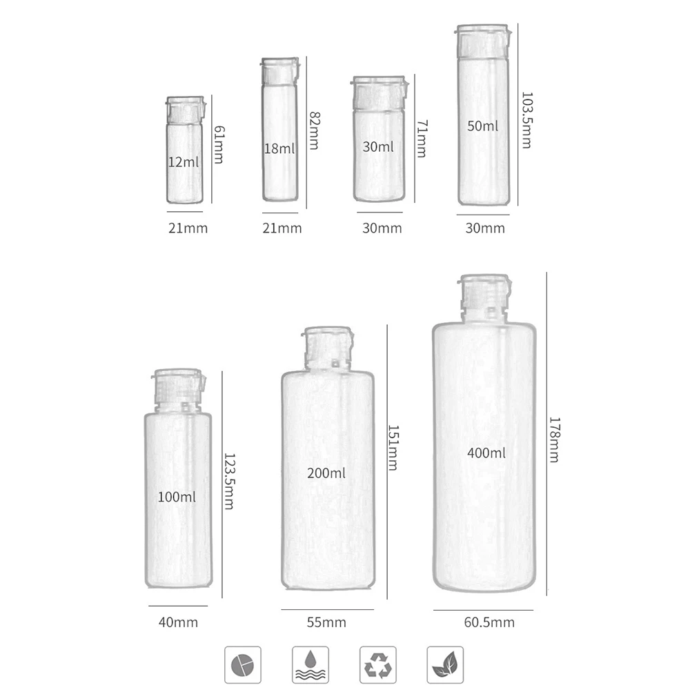 Тип: пустая бутылка Цвет: белый Ёмкость: 18 мл/30 мл/50 мл/100 мл/200 мл/400 мл Материал: Пластик Посылка включает в себя: 1 шт. пустая бутылка