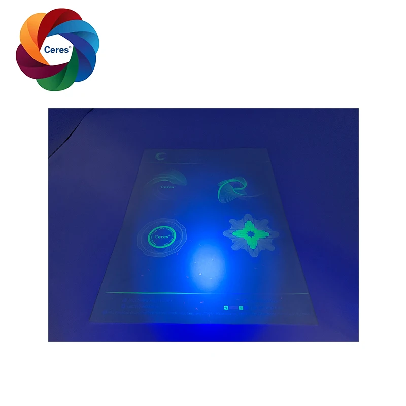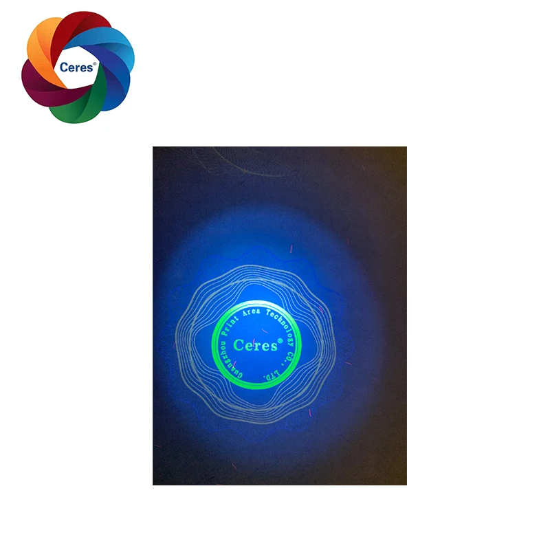 Introduction of UV invisible ink: UV invisible ink, it is kind of transparent ink, often to be called invisible ink. Under irradiation 200~ 400 nm light, the invisible ink gives out 400~800 nm visible light. And the color can be red, yellow, green,blue. invisible ink depends on the different irradiation wavelength, there are two kinds,Irradiation light wavelength 254 nm, the ink is called short wavelength, Irradiation light wavelength 365 nm, the ink is called long wavelength, long wavelength ink can be irradiated by both 254nm and 365 nm light, but short wavelength ink only can be irradiated by 254nm light. Invisible UV ink, under common environment, it is transparent, under UV light, it is can be seen as red, blue,yellow,green Used for: Government ( ex: Birth Certificates, Licenses, Passports & etc.,) - Private Banks ( ex: Checks, Bank Draft, Managers Check, Deposit Certificates & etc.,) - Private Companies (ex: Gift Check, Certificates, Plane Tickets, Promotional, IDs, VISA Card, Membership Card & etc.) - Medical /Pharmaceuticals Companies (ex: Medical, Health & Beauty Products Packaging) - Universities/ Colleges (ex: Diploma, Transcript of Records, IDs & etc.) Patterns and logos printed with security ink can be checked by magnetic detector,and printed passwords can be read out by information decoder and recognized through rubbing effect of automatic processing device. Color: colorless-blue, colorless-red,colorless to yellow,colorless to green Colorless in the sunlight, but can reflex its ture color under the UV light, just like the pictures show below.