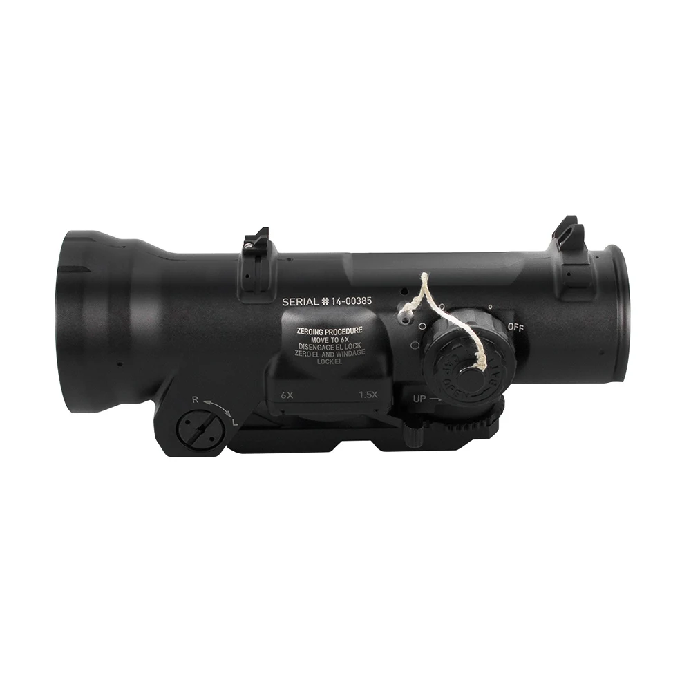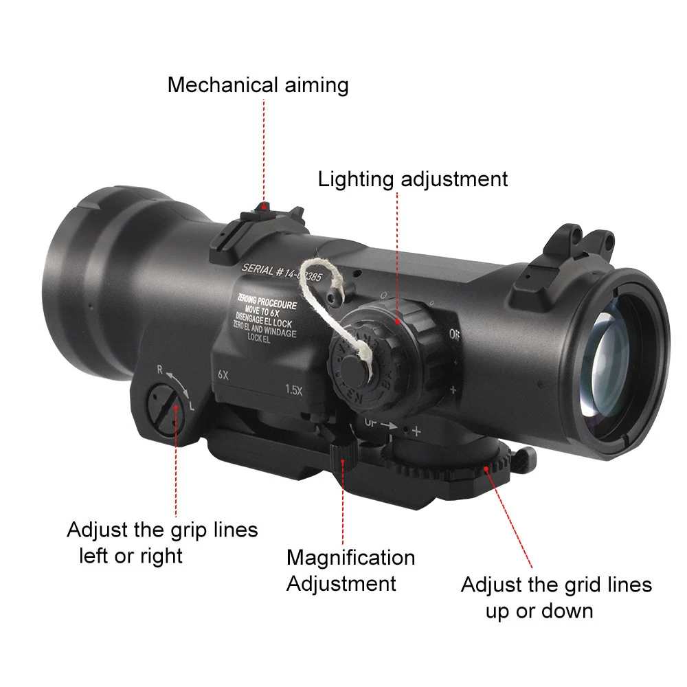 Magnification:1.5 - 6 x Objective Lens Diameter: 42 mm Illumination Type: LED Illumination Color: Red Brightness Settings: 5 Eye Relief: 70 mm Exit pupil: 70 mm Adjustment Type: MOA Adjustment Click Value: 0.5 MOA Adjustment Range: 120 MOA Field of View, Angle: 4 - 16 degrees Parallax: Fixed Focus Range: 20 m to Infinity Attachment/Mount Type: Picatinny Battery Type: DL1/3N Battery Life: 600 - 3000 hours Weather Resistance: Shock Resistant Water Resistance Level: Waterproof for 2 hours Water Resistant Mark: 66 ft Shockproof: Yes Length: 183 mm Width: 75 mm Height: 73 mm Weight: 705 g Finish: Hard Anodized Fabric/Material: Aluminum Battery type: CR1632 (not included) Made In China