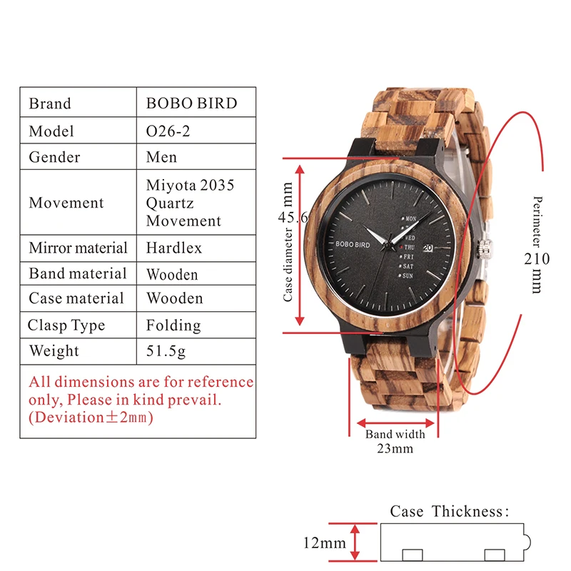 Due to the variable nature of wood, the color of your watch may be slightly different from the photo making your watch one-of-a-kind.