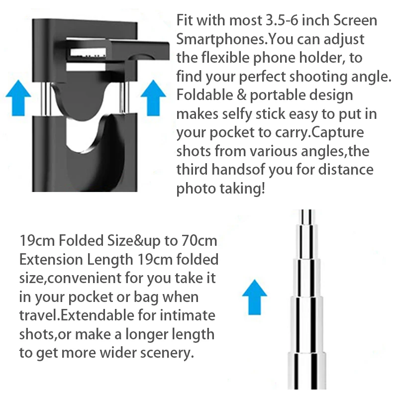 1. Всего 19,5 см в длину, легкий и компактный, легко носить с собой. 2. Независимое устройство дистанционного управления Bluetooth, подключение мобильный телефон Bluetooth, вы можете дистанционно управлять мобильный телефон для фотографирования. 3. Для iOS 5,1 или выше для Apple мобильный телефон, Android системы 4,3 или выше Android мобильный телефон. Цвет: черный, белый Материал: ABS + нержавеющая сталь Подходит для: мобильных телефонов Вес оборудования: около 130 г Размер изделия: около 195 мм * 35 мм * 40 мм/7,68*1,38*1,57 дюйма Версия Bluetooth: Bluetooth4.0 Расстояние передачи Bluetooth: 10 м Поддерживаемый Размер телефона: 4,7-6,0 дюймов