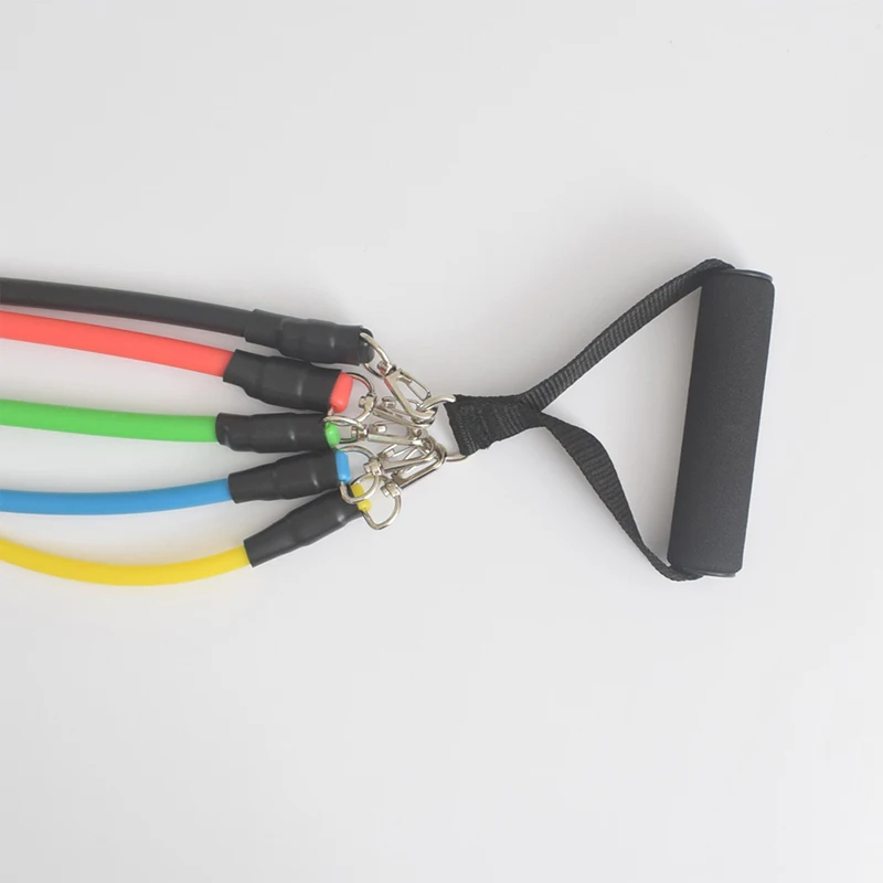 Набор из 11 эластичных лент включает в себя пять лент для упражнений, дверной анкер, две амортизирующие ручки, чехол для переноски и руководство пользователя, которые могут удовлетворить тренировки мышц в различных частях.