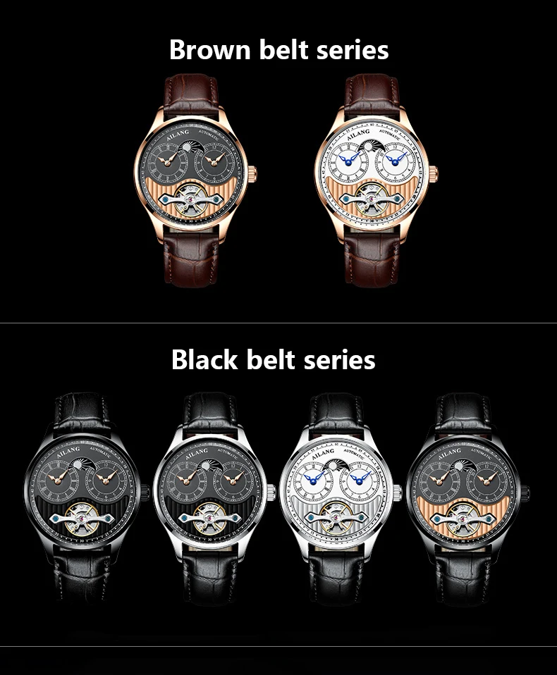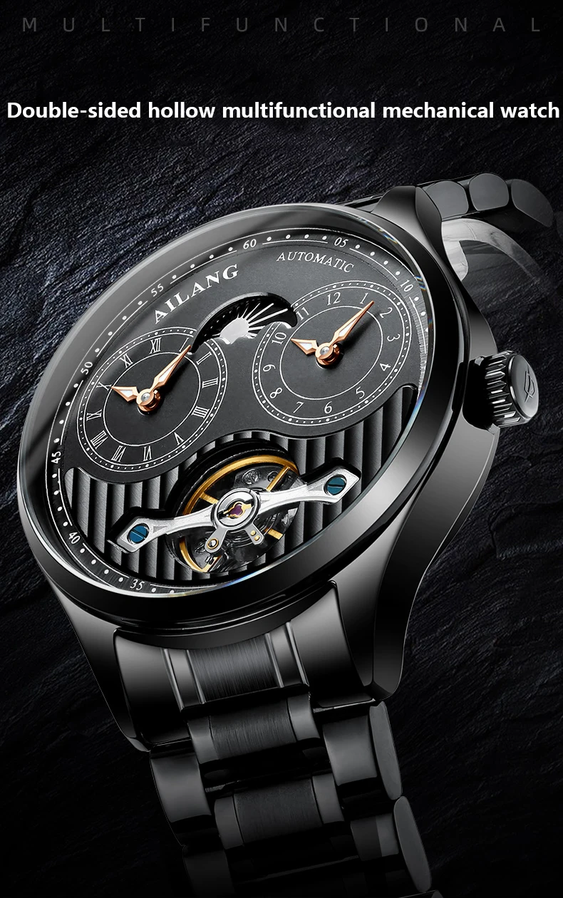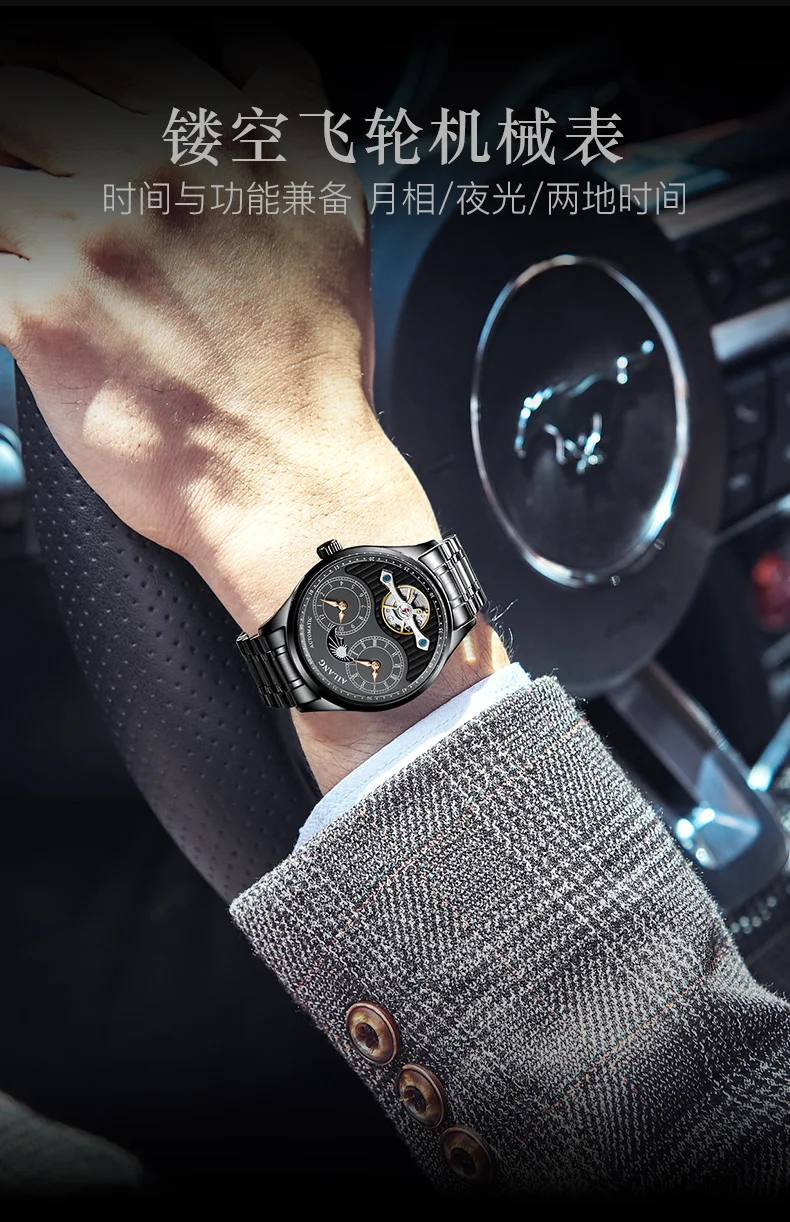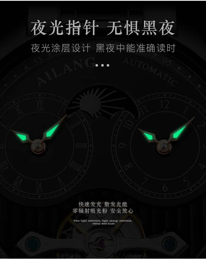 Двухсторонние полые многофункциональные механические часы Вы можете настроить два вида времени, когда день и ночь GMT в двух местах. Полое движение непосредственно проецируется на дно, с сильной светящейся функцией. Атмосферная поверхность, тщательная работа.